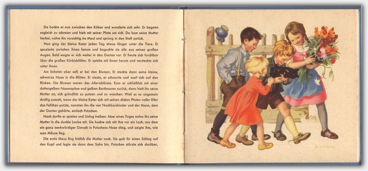 Um 1940/41 erschien im Walter Flechsig Verlag Dresden, das Bilderbuch Putzchen – Aus dem Leben eines kleinen Katers. Der Geschichte des kleinen Katers verfasste Ines-Angelika Mosig. Die wunderbaren Illustrationen stammen von Norbertine von Breßlern-Roth. Das Buch hat das Format von 17 x 19 cm, der Umfang beträgt 16 Seiten. Neben einem Pappband zu Preis von 1,60 RM erschien auch ein Halbleinenband. Beide Ausgaben haben ein montiertes, farbiges Titelbild.