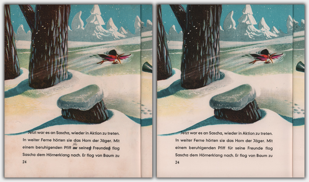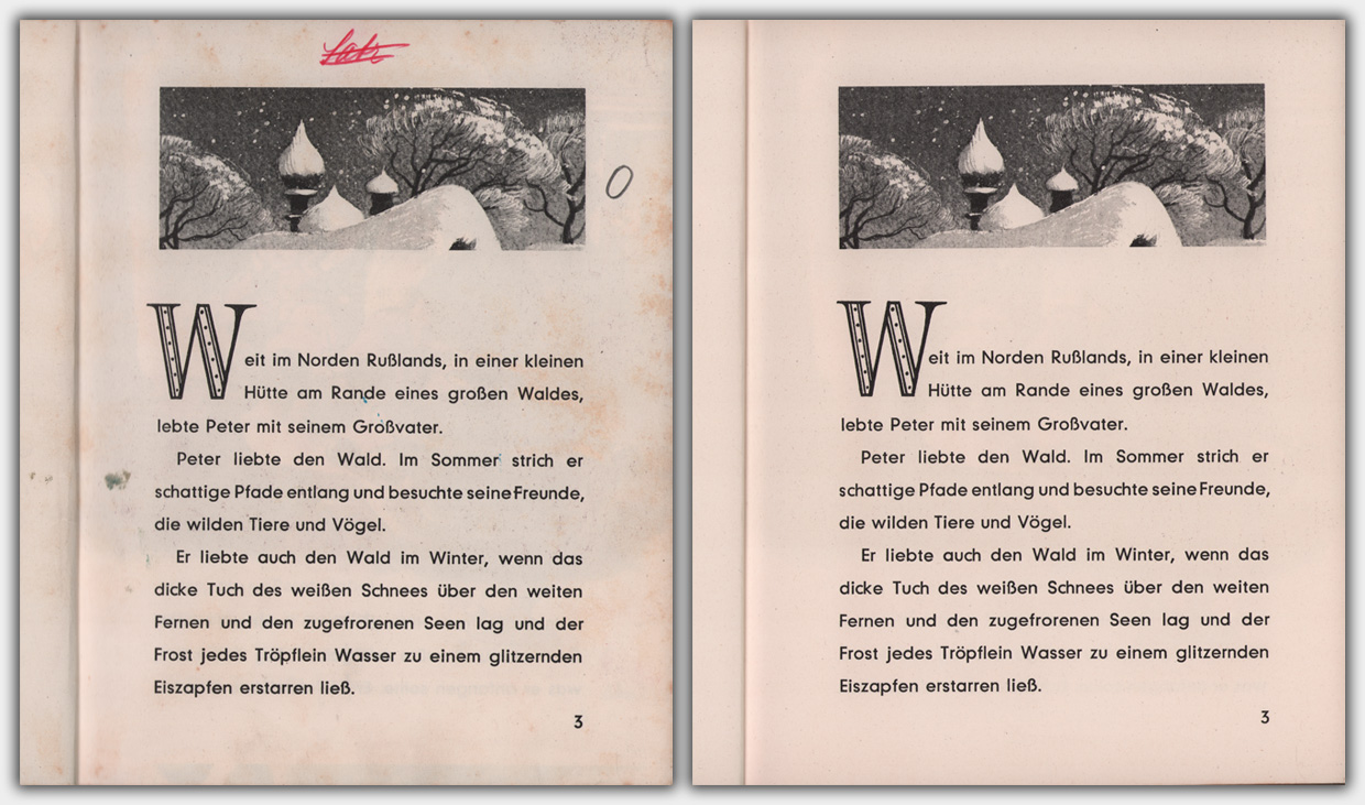Zur besseren Übersicht habe ich den einzelnen Beispielseiten jeweils die entsprechende finale Seite eines Archiv-Exemplars gegenüber gestellt.