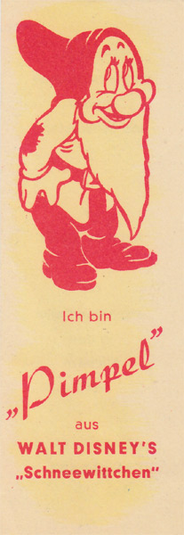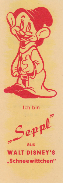 Mir liegen drei Varianten vor. Eins zeigt Bambi, die anderen beiden jeweils einen Zwerg aus dem Buch Schneewittchen und die sieben Zwerge. Die Rückseiten zeigen jeweils einen kurzen Werbetext. Ich vermute das es mindestens weitere Motive mit den anderen Zwergen sowie mit Schneewittchen gibt, außerdem weitere Motive zu Bambi.
