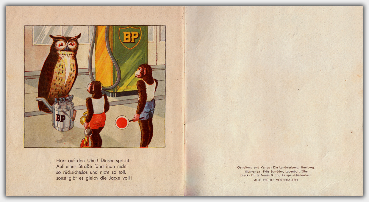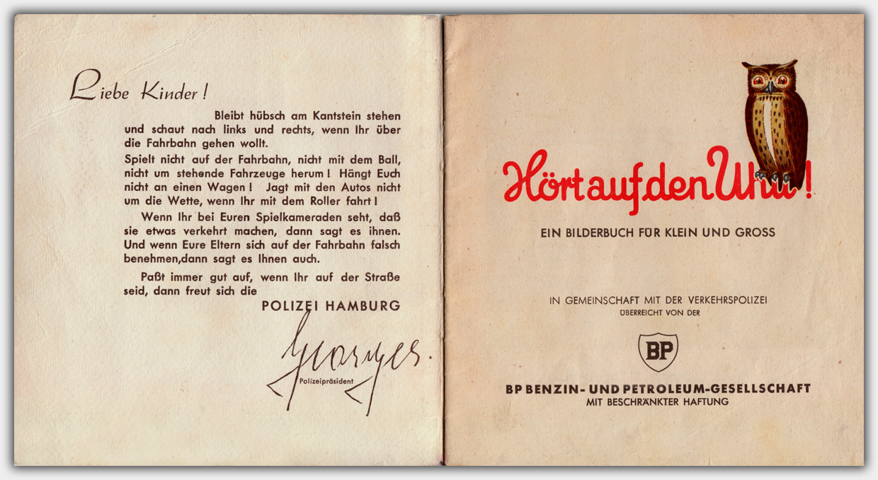 Anfang der 1950er Jahre erschien im Verlag Die Landwerbung, Hamburg eine kleine Broschüre. Sie wurde in Gemeinschaft mit der Verkehrspolizei herausgegeben und von der BP Benzin- und Petroleum-Gesellschaft vertrieben. Der Zusatz “mit beschränkter Haftung” deutet auf ein Erscheinen zwischen 1950 (Umbenennung von OLEX in BP) und 1957 (Umwandlung in eine AG) hin.