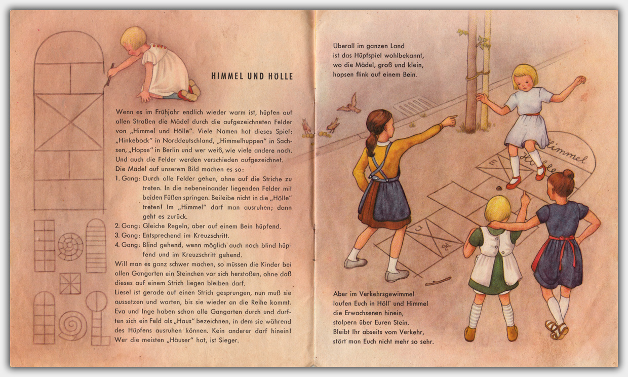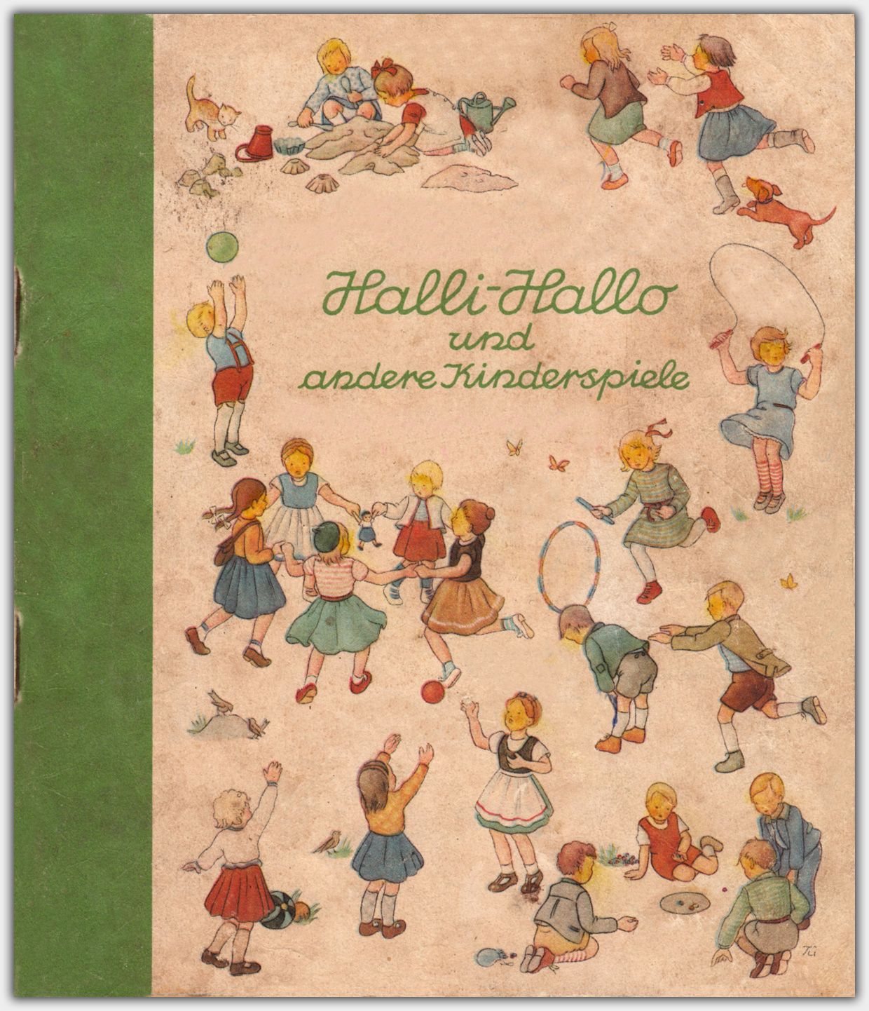 Ein weiteres Heft liegt mir vor. Es trägt den Titel Halli-Hallo und andere Kinderspiele. Das Format ist 17 x 14,5 cm, der Umfang 24 Seiten. Die Illustrationen stammen von Else Tümmel. Wahrscheinlich gibt es auch hier regionalisierte Versionen. Bei diesem Exemplar gibt es ein Vorwort vom Stuttgarter Polizeipräsidenten Gustav Supper (im Amt bis 31.10.1956). Leider ist der Titel hier sehr verschmutzt.