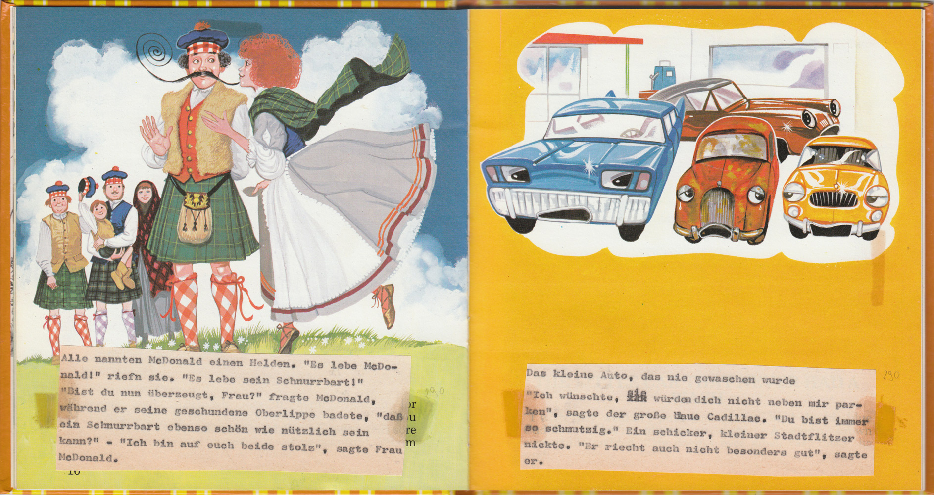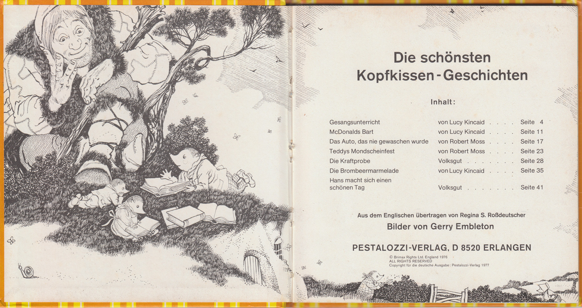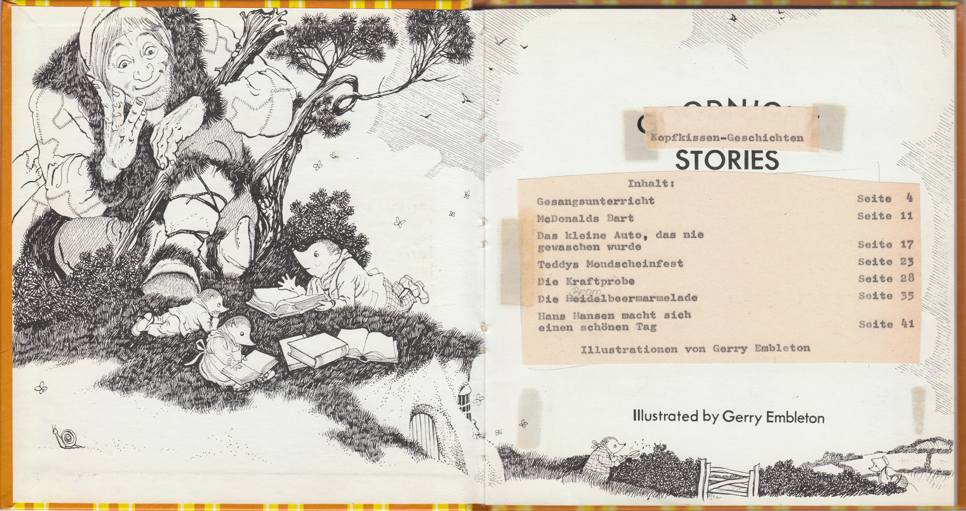 Mir liegt ein Arbeitsexemplar des Titels Seven Goodnight Stories. Das Buch diente für die Übersetzung ins deutsche. Die englischen Texte sind mit Papierschnipseln überklebt auf denen mit Schreibmaschine der deutsche Text getipp wurde. Zum Vergleich habe ich Abbildungen der fertigen deutschen Ausgabe des Titels Die schönsten Kopfkissen-Geschichten gegenübergestellt.