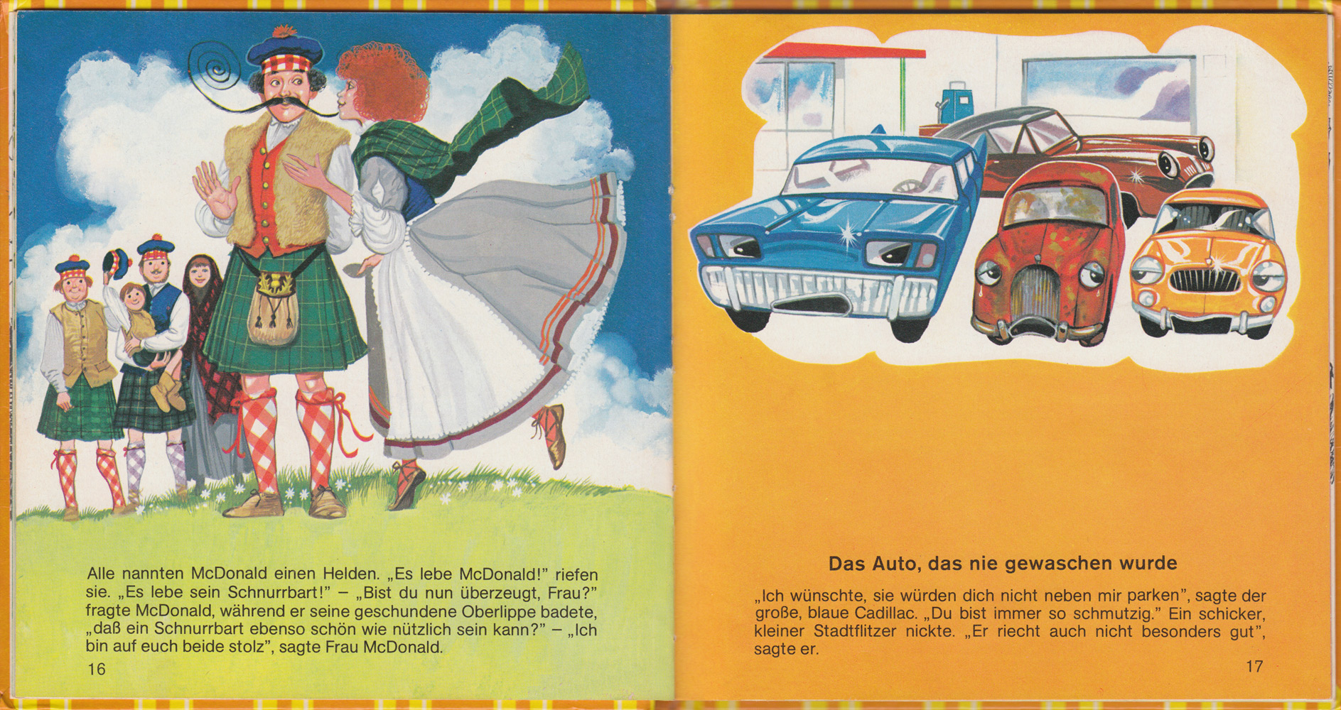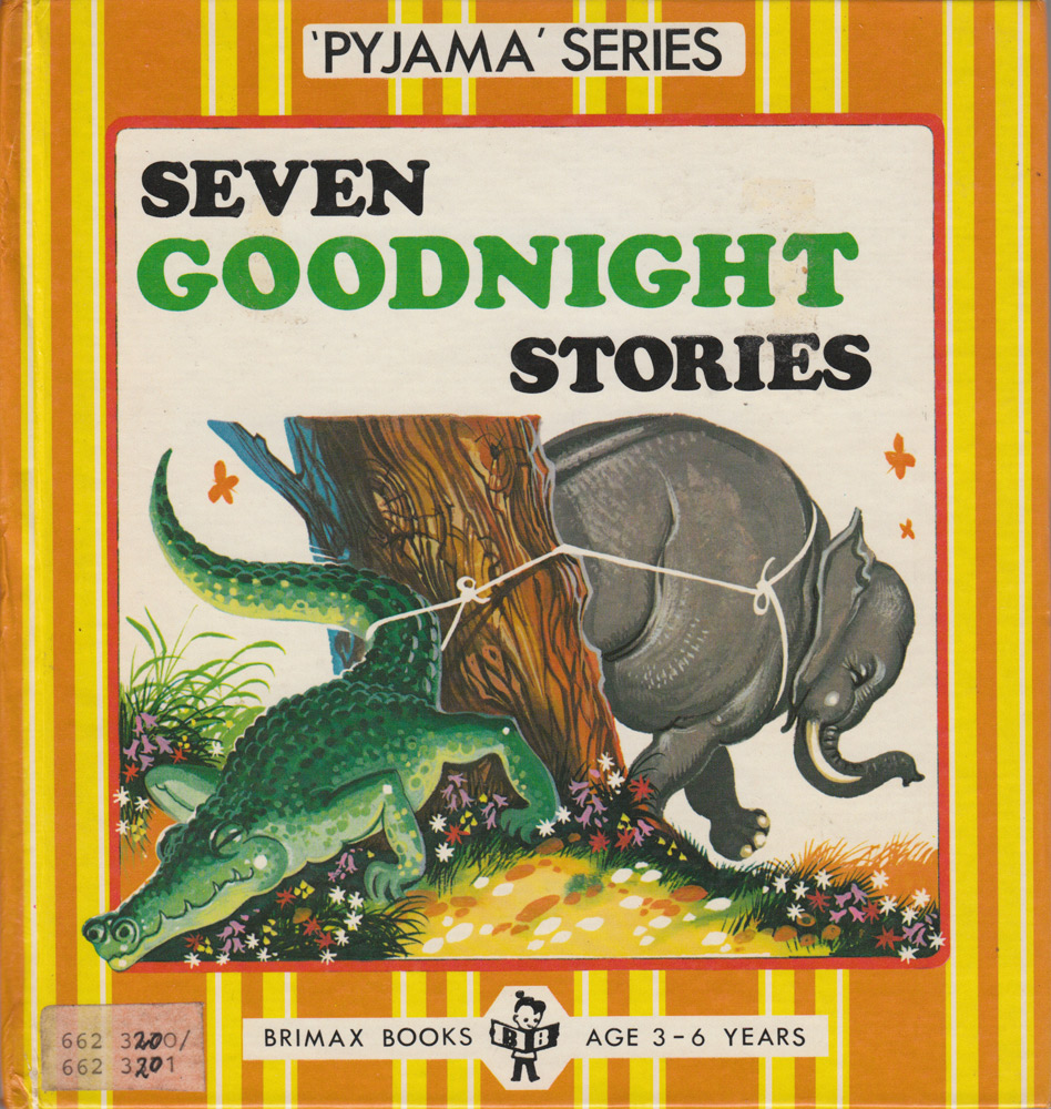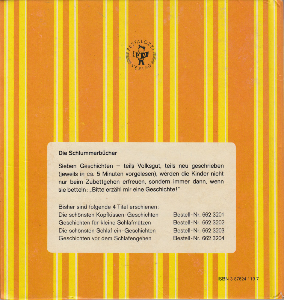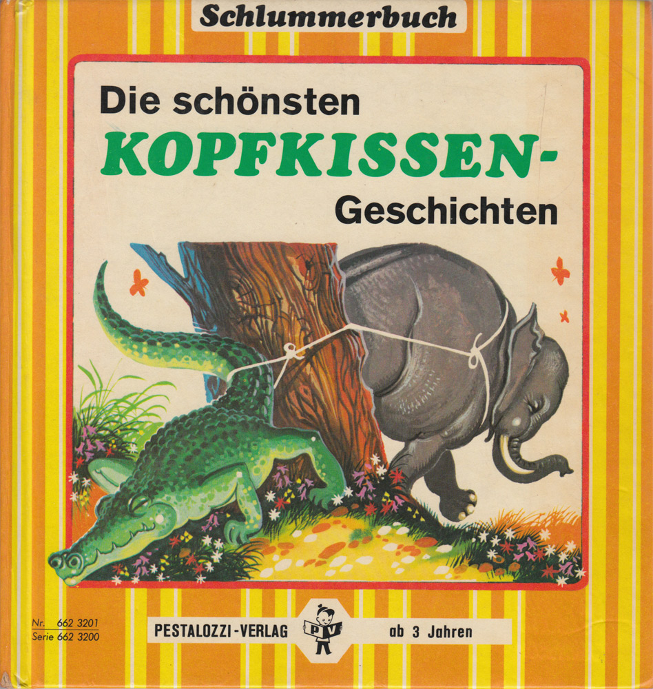 Mir liegt ein Arbeitsexemplar des Titels Seven Goodnight Stories. Das Buch diente für die Übersetzung ins deutsche. Die englischen Texte sind mit Papierschnipseln überklebt auf denen mit Schreibmaschine der deutsche Text getipp wurde. Zum Vergleich habe ich Abbildungen der fertigen deutschen Ausgabe des Titels Die schönsten Kopfkissen-Geschichten gegenübergestellt.