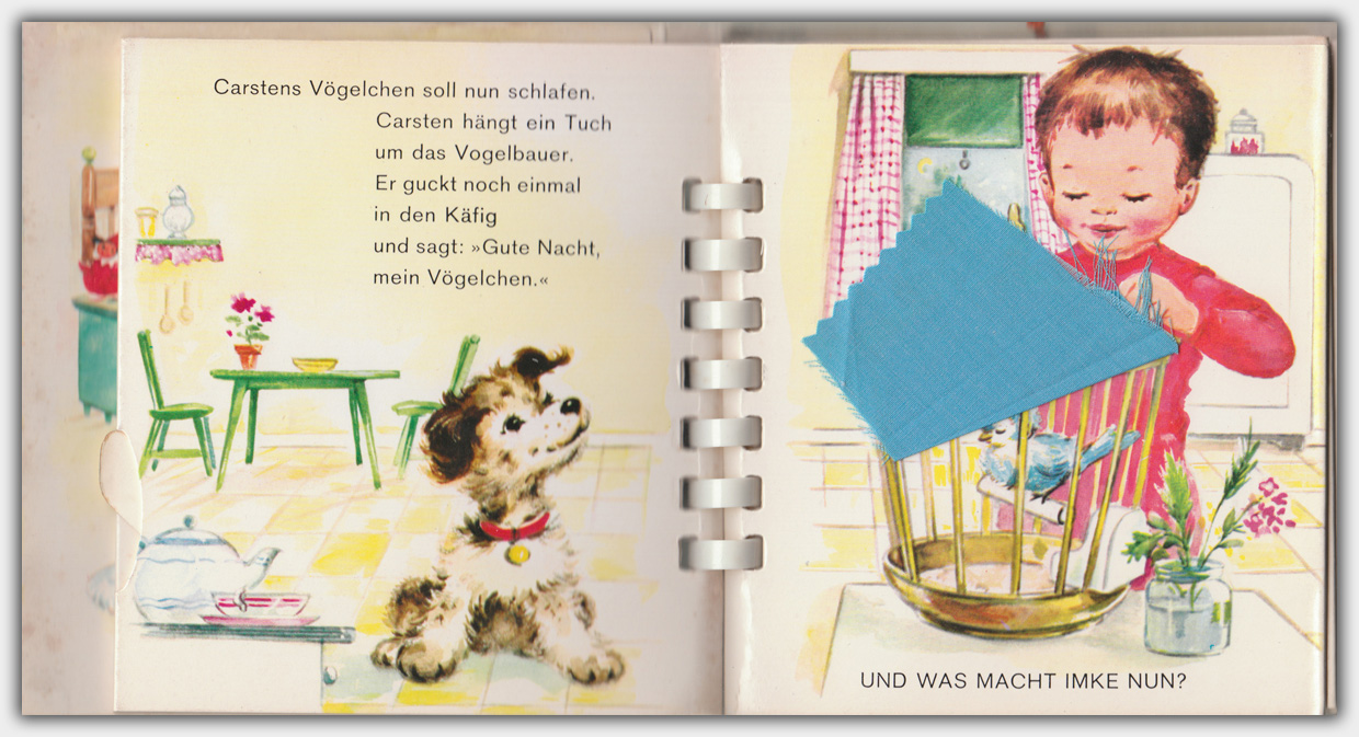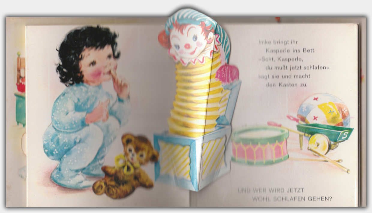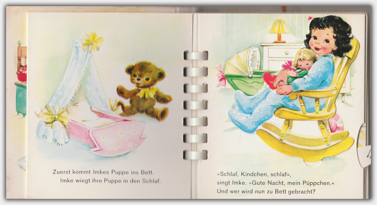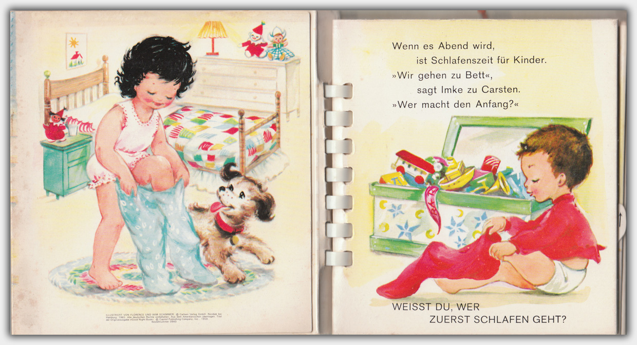 1965 brachte der Carlsen Verlag die beiden Bewegungs-Bücher mit den Titeln Guten Morgen und Gute Nacht heraus. Die amerikanischen Orginalausgaben erschienen 1959 bei Capitol Publishing Company, Inc. Von Florence und Wim Schimmer stammen die Texte und Illustrationen. Die Orginaltitel lauten