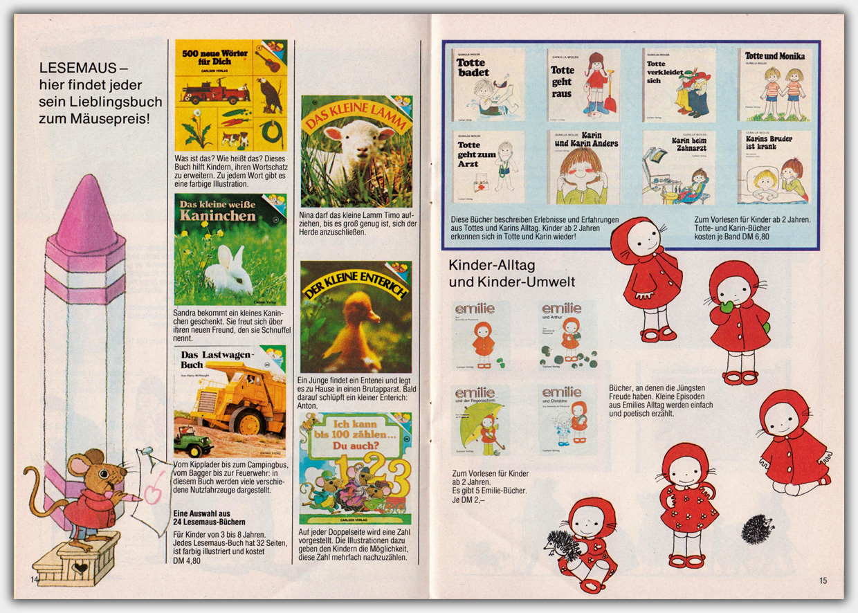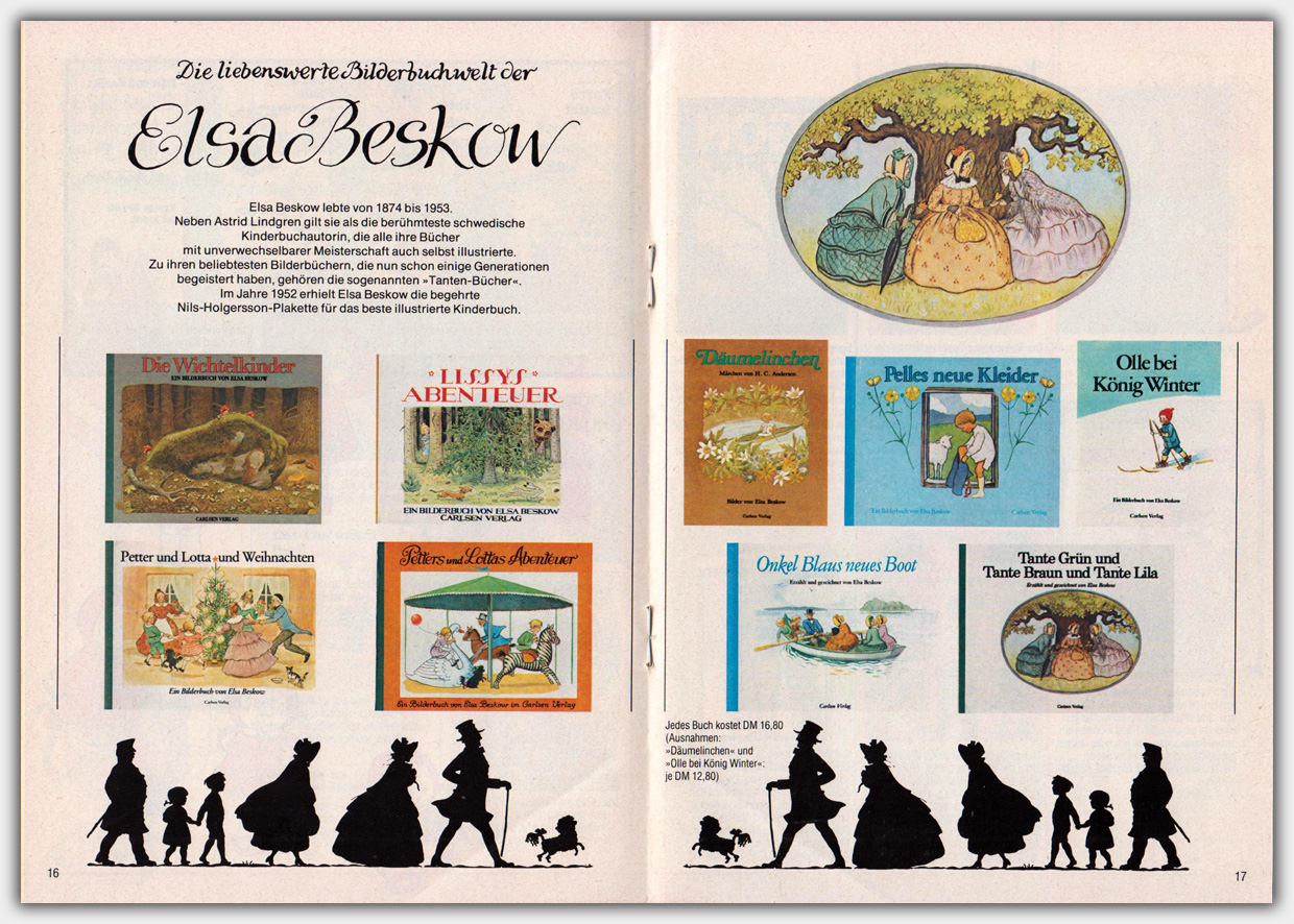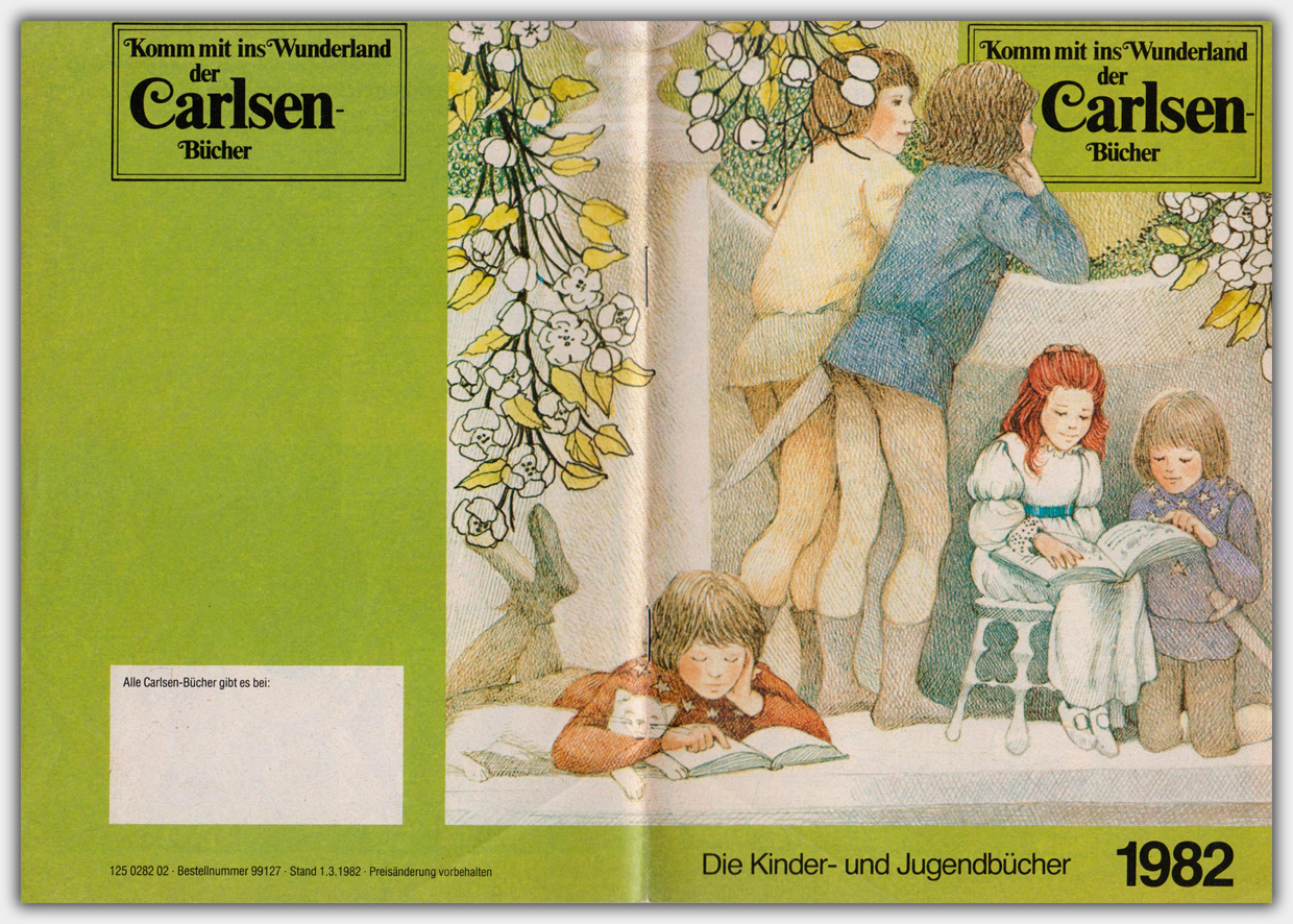 Der Carlsen Prospekt vom Frühjahr 1982 hat das Format von ca. 14,8 x 21 cm und einen Umfang von 32 Seiten. Er trägt den Titel Komm mit ins Wunderland der Carlsen-Bücher.