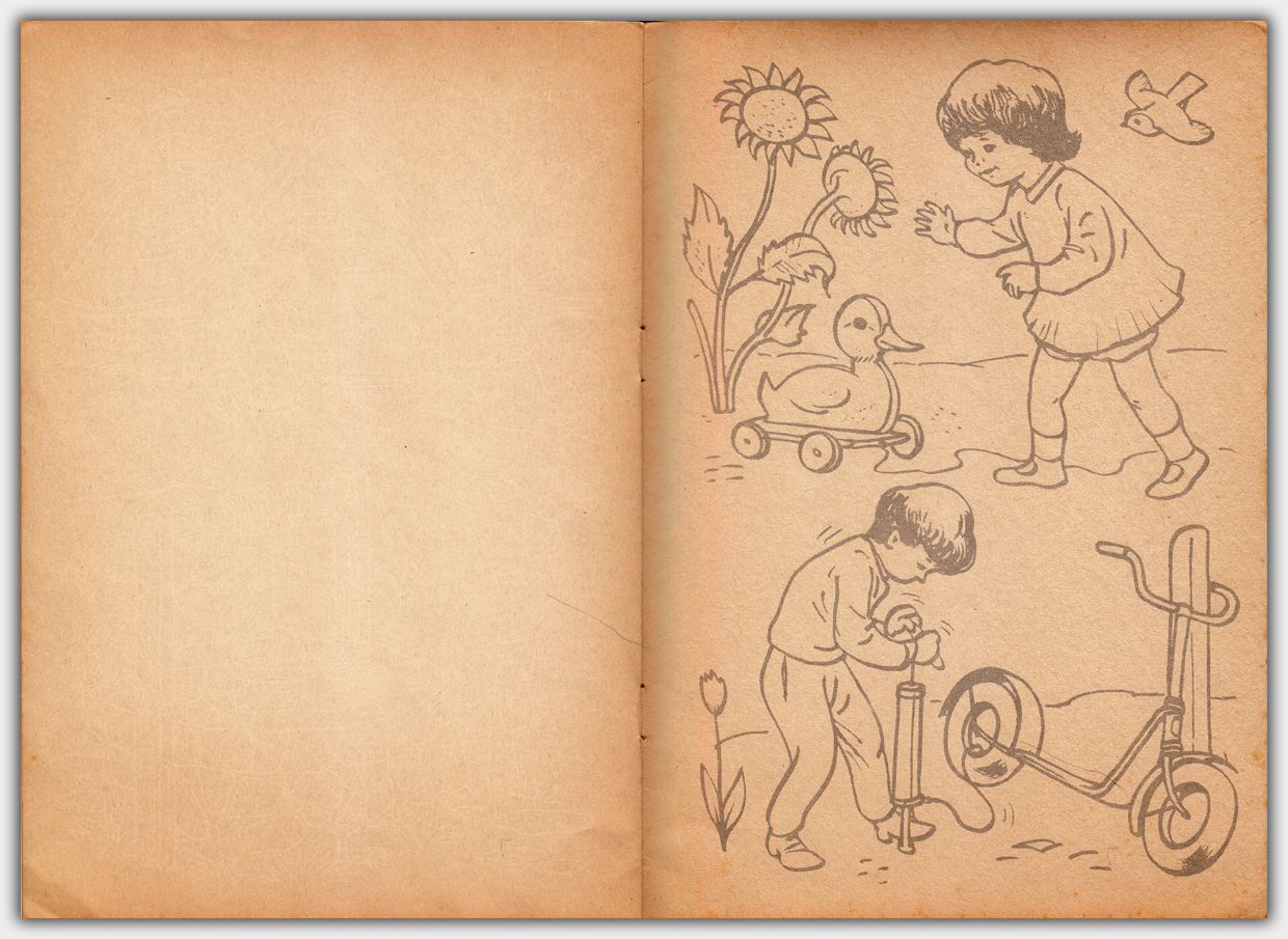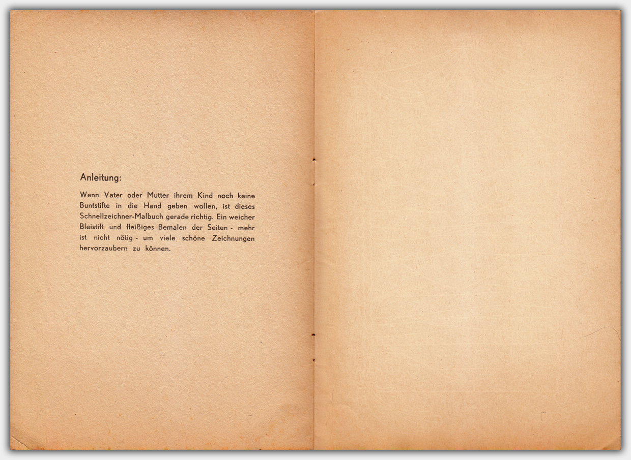 Unter der Bezeichnung Schnellzeichner wurden Hefte angeboten, die augenscheinlich aus unbedruckten Seiten bestanden. Bei genauerer Betrachtung erkennt man aber einen farblosen Druck. Die Oberfläche soll mit einem weichen Blei- oder Buntstift leicht schraffiert werden und gibt so ein Motiv frei. Das Foto unten ist etwas bearbeitet, um den farblosen Druck zu zeigen.
