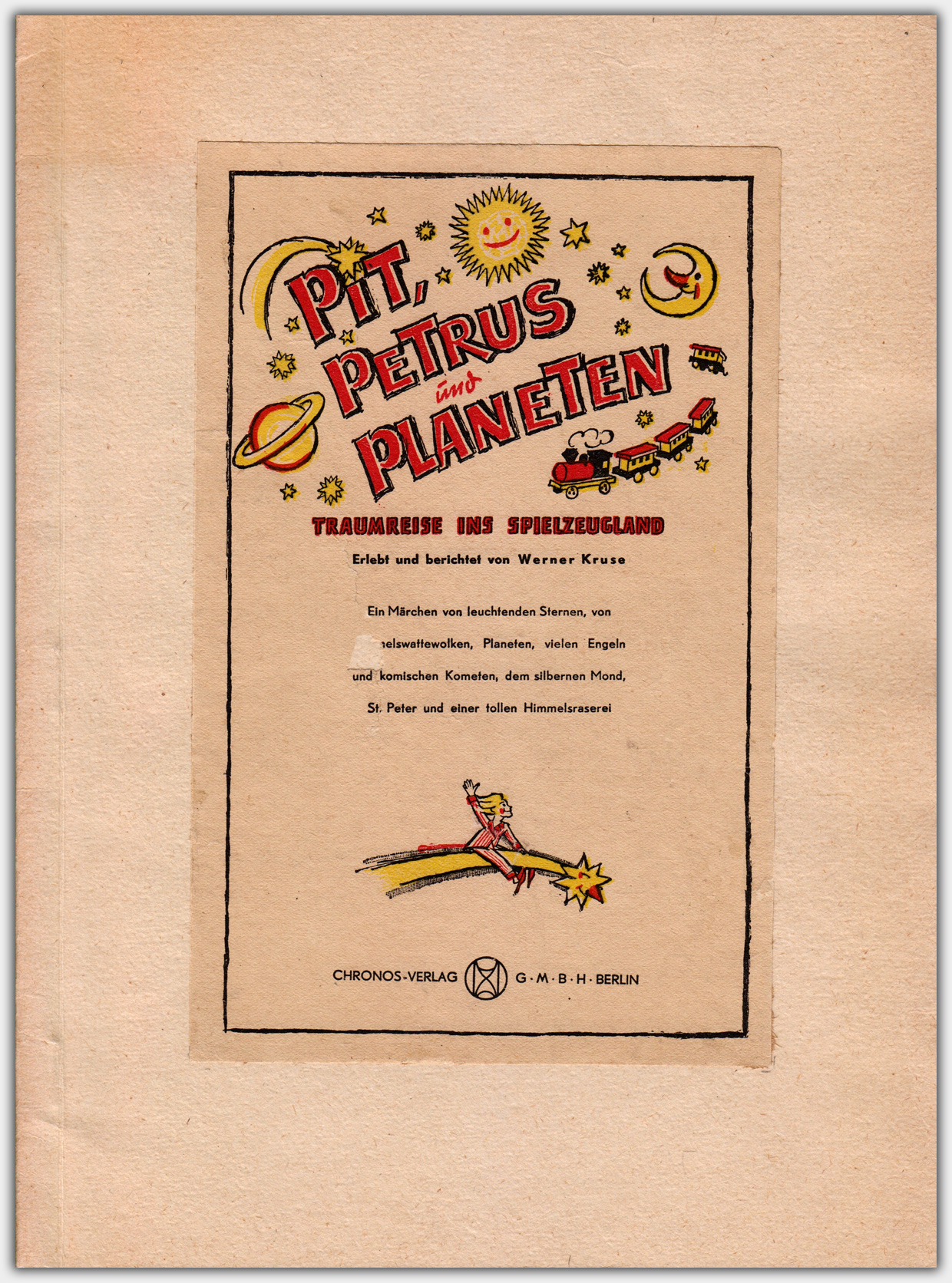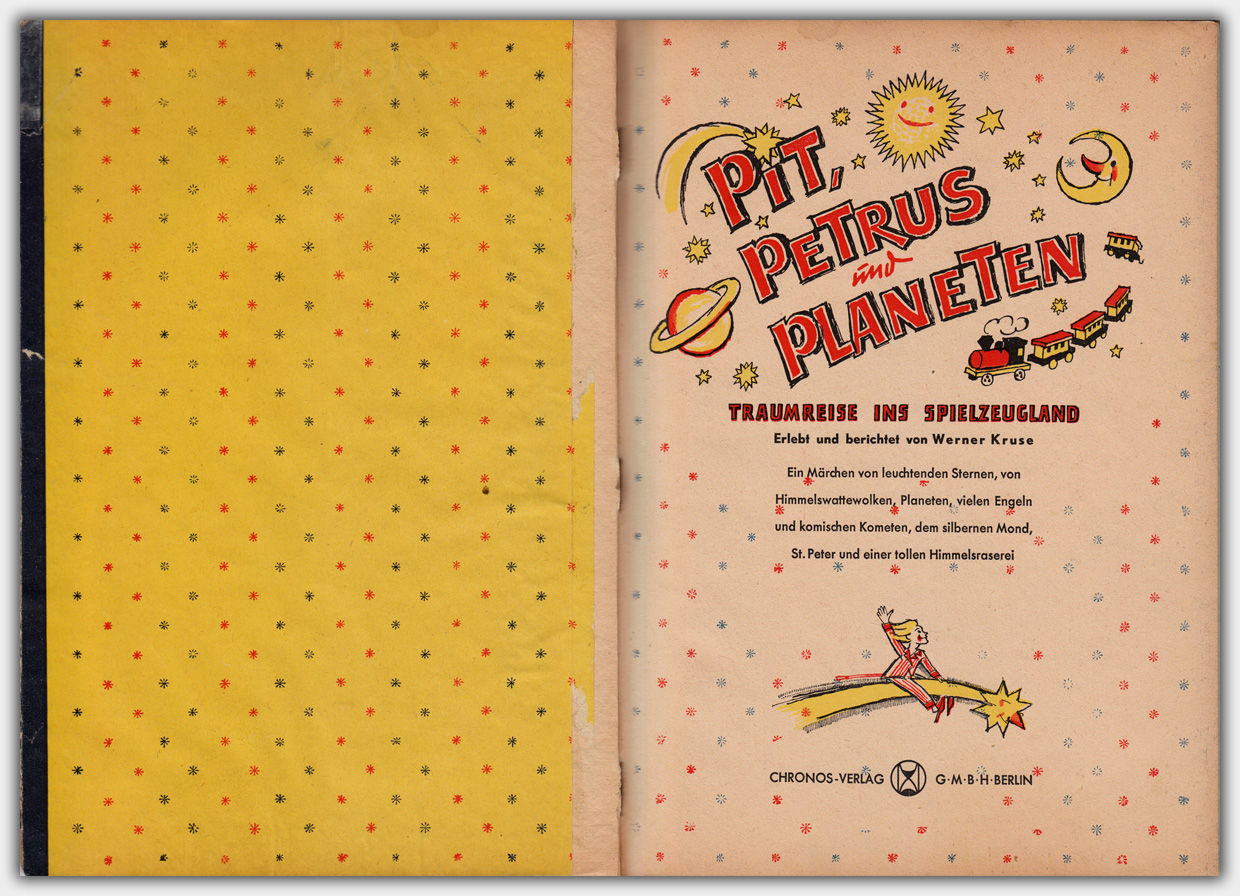 Das Buch Pit, Petrus und Planeten – Traumreise ins Spielzeugland erschien 1948 im Berliner Chronos Verlag.