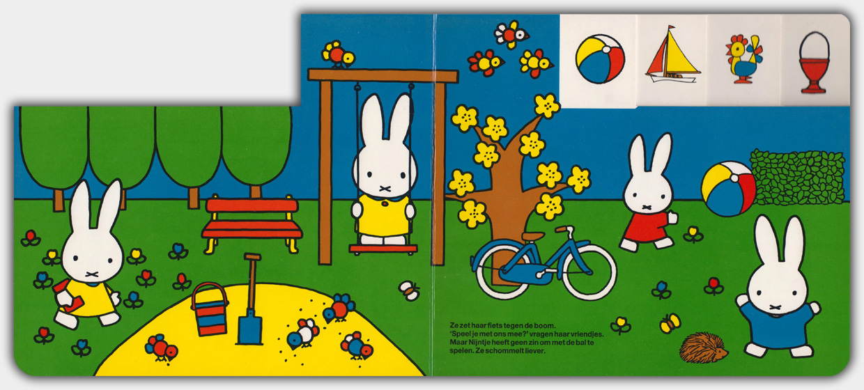 : Nijntje in het park. Mir liegen die Titel als Registerbücher vor. Produziert wurden sie 1988, vermutlich vom Pestalozzi Verlag. Allerdings gibt es keine Hinweise zu Pestalozzi im Buch.