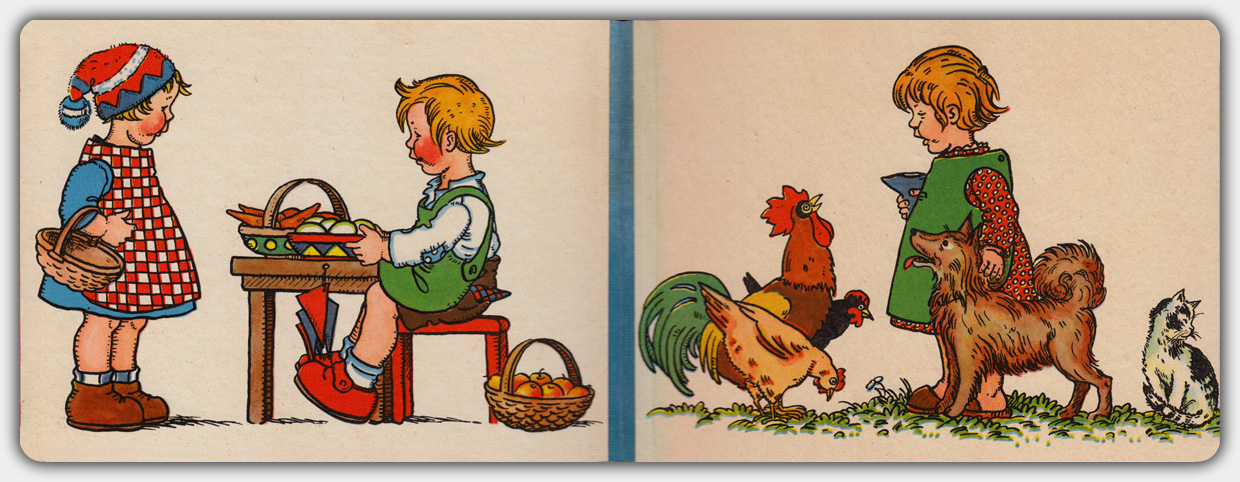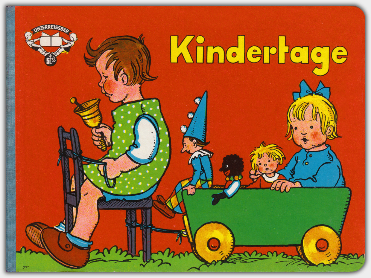 Aus dem F. W. Stritzinger Verlag liegen mir zur Zeit zwei unzerreißbare Pappbilderbücher vor. Das erste hat die Verlagsnummer 271 und trägt den Titel Kindertage. Es gibt zwar keine Autorenangaben, aber die Illustrationen stammen eindeutig von Lilly Scherbauer. Das Buch findet sich als Neuauflage von 1953 im ⇒ Katalog der deutschen Nationalbibliothek. Es kostete 1,65 DM.