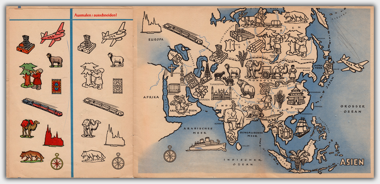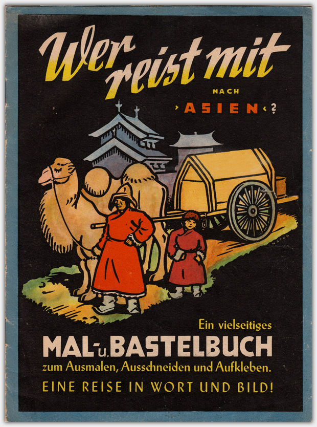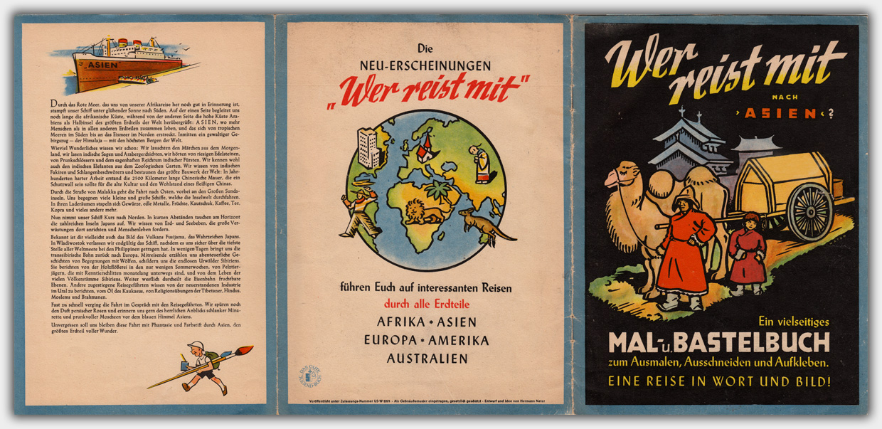 Das Heft Wer reist mit nach Asien ist als Wickelfalz mit 6 Seiten angelegt. Zusätzlich ist ein 4-seitiger Bogen mit Motiven zum Ausmalen und Ausscheiden eingeheftet. Das Format des Heftes beträgt 27,5 x 20 cm (eingeklappt) bzw. 27,5 x 60 cm ausgeklappt. Erschienen ist das Heft 1949 unter der Verlagslizenz US-W-2001. Entwurf und Idee stammen von Hermann Nater. Der Verkaufspreis betrug 0,40 (DM).