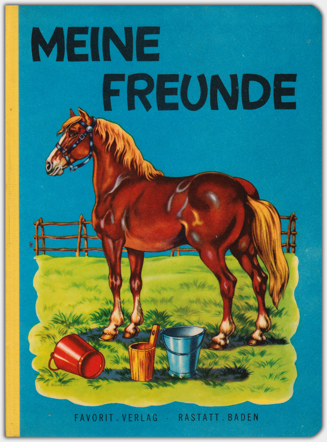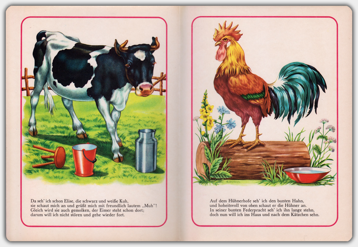 Die Bücher der Reihe Nr. 593 haben das Format 26,5 x 19,5 cm und einen Umfang von 4 Kartonblättern. Zur Reihe gehören mindestens 4 Titel. Erschienen sind die Bücher aufgrund der Verlagsnummer vermutlich in der zweiten Hälfte der 1960er Jahre. Leider liegt mir erst ein Titel vor. Das Buch Meine Freunde hat die Nummer 593 D und wurde von Erika Durban (Erika Durban-Hofmann) illustriert.