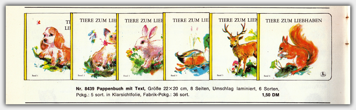 1968 erschien im Favorit Verlag die Reihe Tiere zum Liebhaben. Die 6 Bände im Format 20 x 22 cm haben einen Leinenrücken und einen Umfang von 4 Kartonblättern. Der Verkaufspreis betrug 1,50 DM. Die Verlagsnummer der Reihe lautet No. 8439. Es gibt weder Buchtitel noch Autorenangaben.