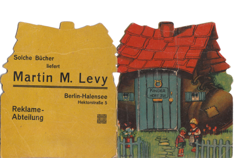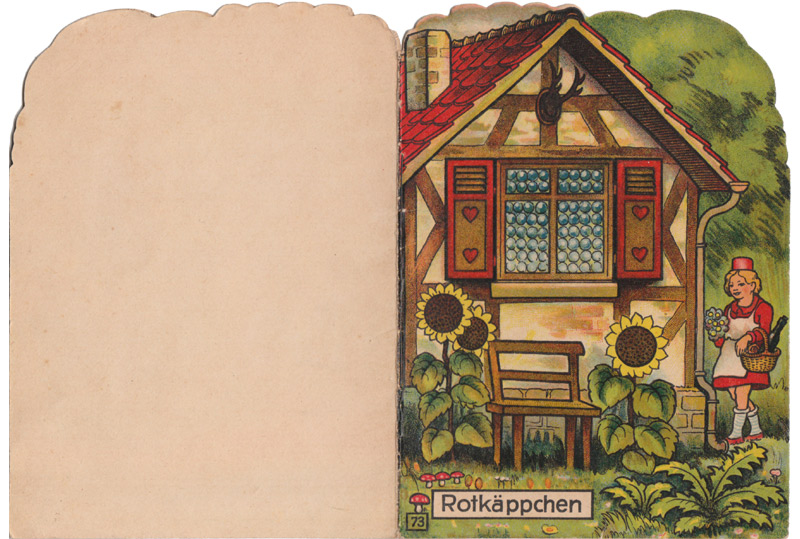 Diese Hefte haben die Form eines Gebäudes. Die abgebildete Tür ist freigestanzt und läßt sich öffnen. Der Titel steht jeweils auf der Tür. Das Format ist ca. 13,5 x 11,5 cm. In den Pappumschlag sind jeweils zwei Blätter eingeheftet, so kommt man auf Umschlag plus 8 Seiten. Die ersten und letzten Innenseiten sind farbig illustriert, die weiteren nur einfarbig.
