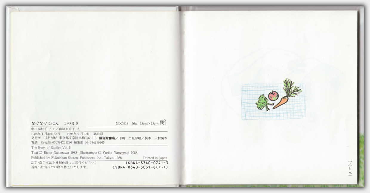 1988 erschien mit dem Titel なぞなぞえほん 1のまき / The Book of Riddles Vol. 1 der erste Band einer 3-teiligen Buchreihe. Die kleinen Rätsel für Kinder ab 4 Jahren wurden von Rieko Nakagawa getextet und von Yuriko Yamawaki liebevoll illustriert.