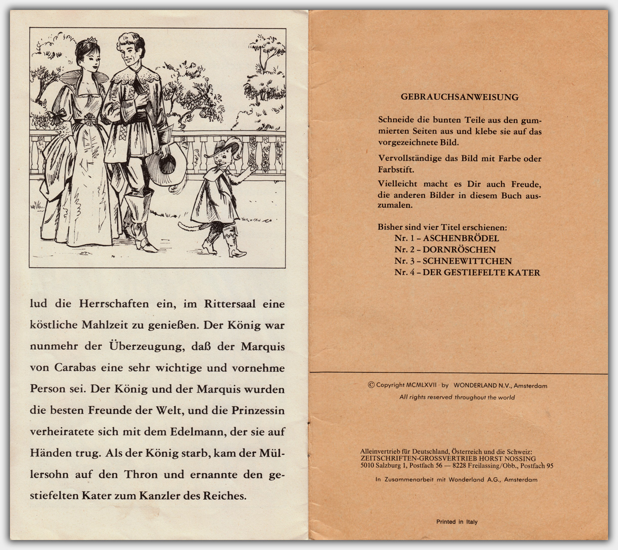Ende der 1960er Jahre erschien in Zusammenarbeit mit Wonderland N.V., Amsterdam eine 4-teilige Heftreihe im Zeitschriften-Grossvertrieb Horst Nossing. Der Reihentitel lautet Ein Märchen-Klebebuch. Die Hefte im Format 26,5 x 15 cm haben den Umfang von 8 Seiten plus einem gummierten Ausschneide-Bogen.