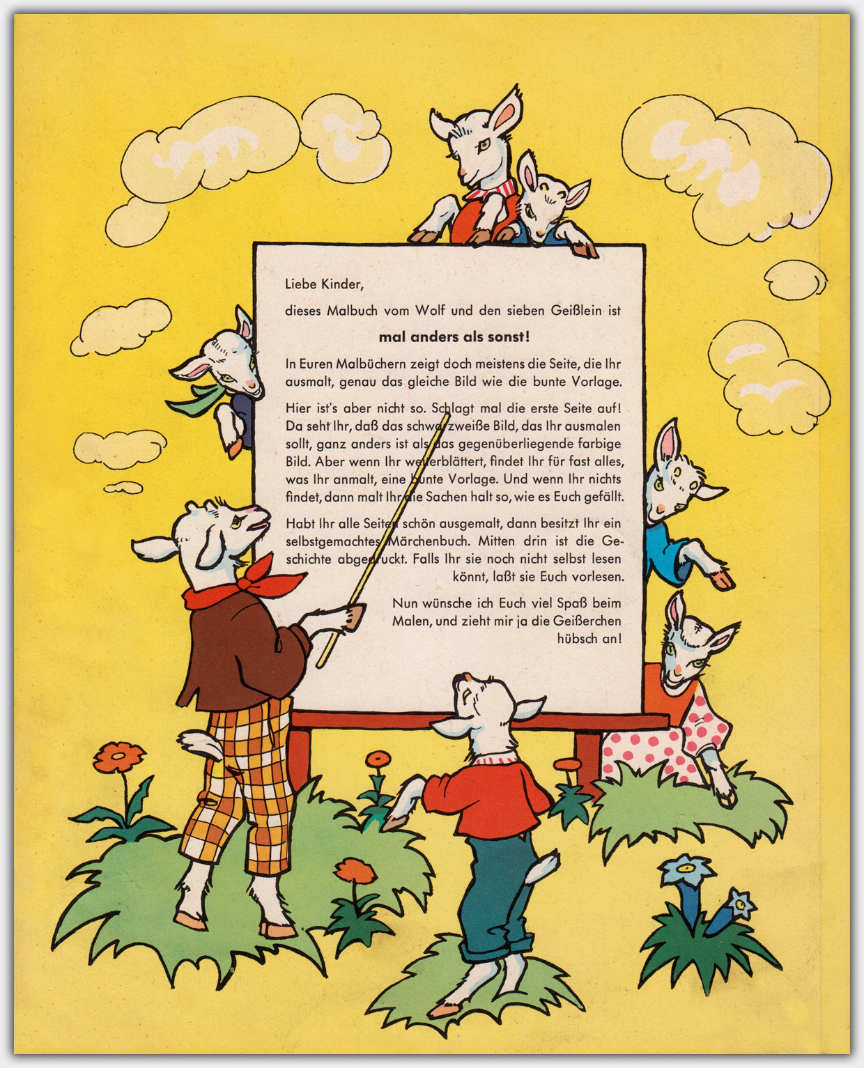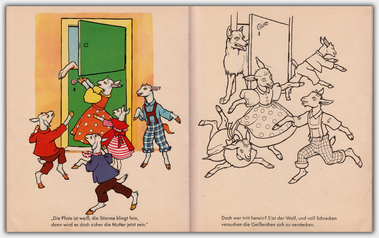 In den 1950er Jahren erschienen im Jos. Scholz-Mainz Verlag die Märchen-Malbücher. Im Unterschied zu normalen Malbüchern, gab es hier keine farbigen motivgleichen Vorlagen. Auf den gegenüberliegenden Seiten waren lediglich Motive mit ähnlichen Elementen, so dass die Kinder ein wenig suchen mußen, um die richtigen Farben herauszufinden. Im Mittelteil war eine Doppelseite mit erzählendem Text. So wurde aus dem Malheft nach dem Ausmalen praktisch ein buntes Bilderbuch.
