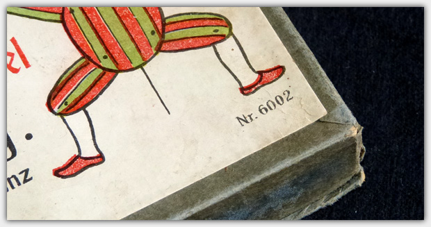 Mir liegt ein Exemplar mit 64 Karten vor. Es trägt die Verlagsnummer 6002 und stammt wohl aus den 1920er bzw. frühen 1930er Jahren. Sicher ist es vor 1933 hergestellt worden, da es einen Händlerstempel der Fa. Gebrüder Bergmann in Leipzig trägt. Die Puppenklinik und Spielwarenhandlung war regelmäßig bis 1932 im Leipziger Adressbuch vertreten. Ab 1933 gibt es dann dort keine Einträge zur Firma oder zu den Eigentümern mehr.