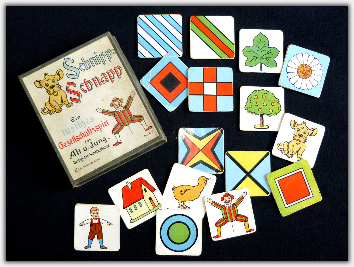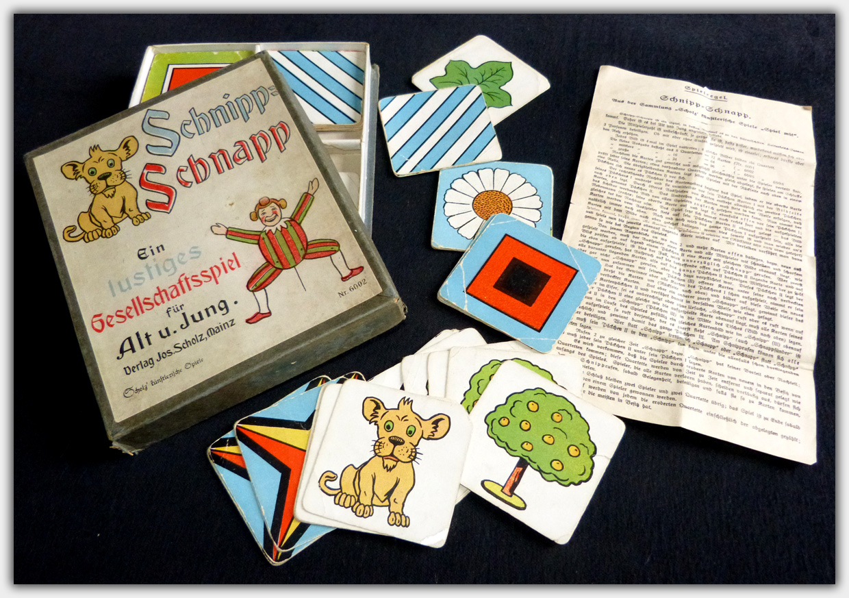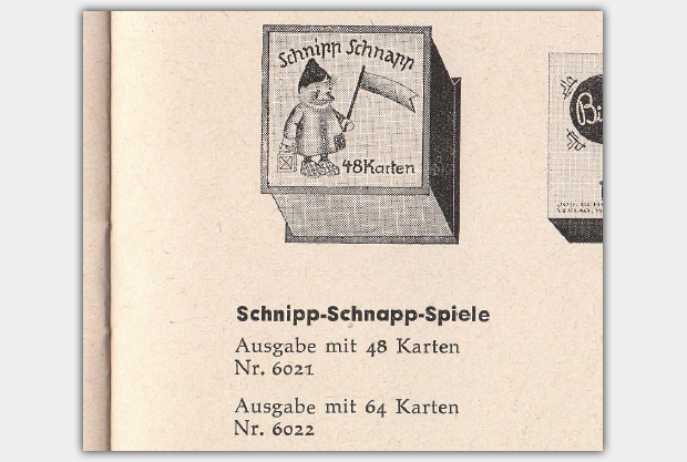 Ein Klassiker der über mehrere Jahrzehnte hinweg produziert wurde ist Schnipp-Schnapp — Ein lustiges Gesellschaftsspiel für Alt und Jung. Das Reaktionsspiel wurde in verschiedenen Versionen mit 32, 48, 64 und 96 Karten angeboten. Neben Überarbeitungen der Verpackungen (inkl. Verlagsnummern) wurden auch mindestens einmal die Kartenmotive ausgetauscht. Die Stülpschachtel meines Exemplars hat das Format von 20 x 17 x 2,5 cm.