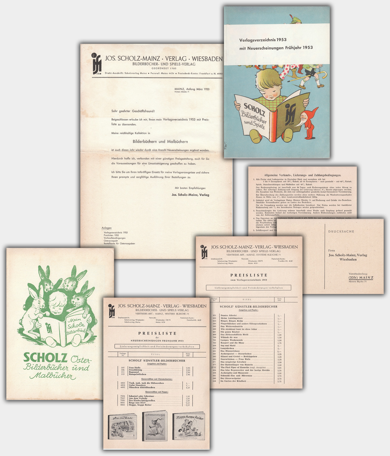 Mir liegt eine komplette Verlagsaussendung vom März 1953 vor. Diese beinhaltet neben einem Anschreiben das Verlagsverzeichnis 1953 inkl. Neuerscheinungen sowie die zugehörigen Preislisten. Dazu kommt ein Osterprospekt mit Bestellkarte und ein Flyer mit den Verkaufsbedingungen.