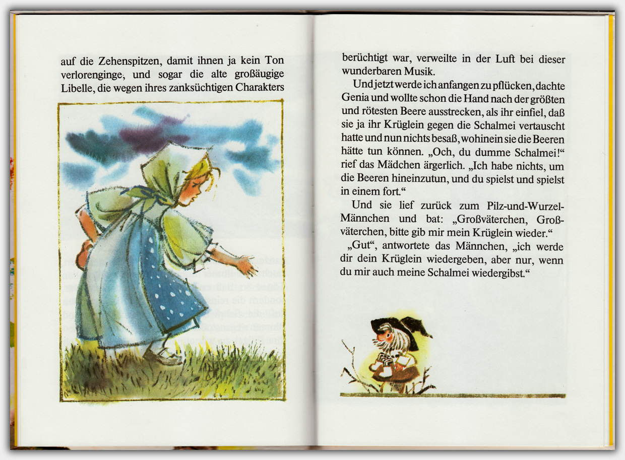 Das Märchen Schalmei und Krüglein handelt von dem Mädchen Genia die mit ihrer Familie in den Wald geht um Erdbeeren zu sammeln. Dort trift es auf das Pilz-und-Wurzel-Männchen.