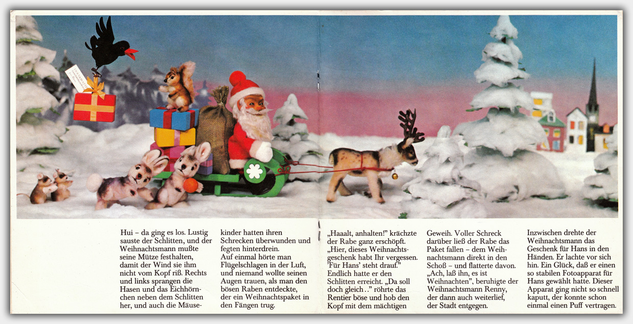 Das Heft ist 20 x 20 cm groß und hat einen Umfang von 12 Seiten. Weihnachtliche Szenen wurden u.a. mit Steiff-Plüschtieren arrangiert und fotografiert. Einige Seiten haben Farbanaglyphenbilder (3-D Bilder in rot und blau). hierfür lag dem Heft eine zweifarbige 3-D-Brille bei.