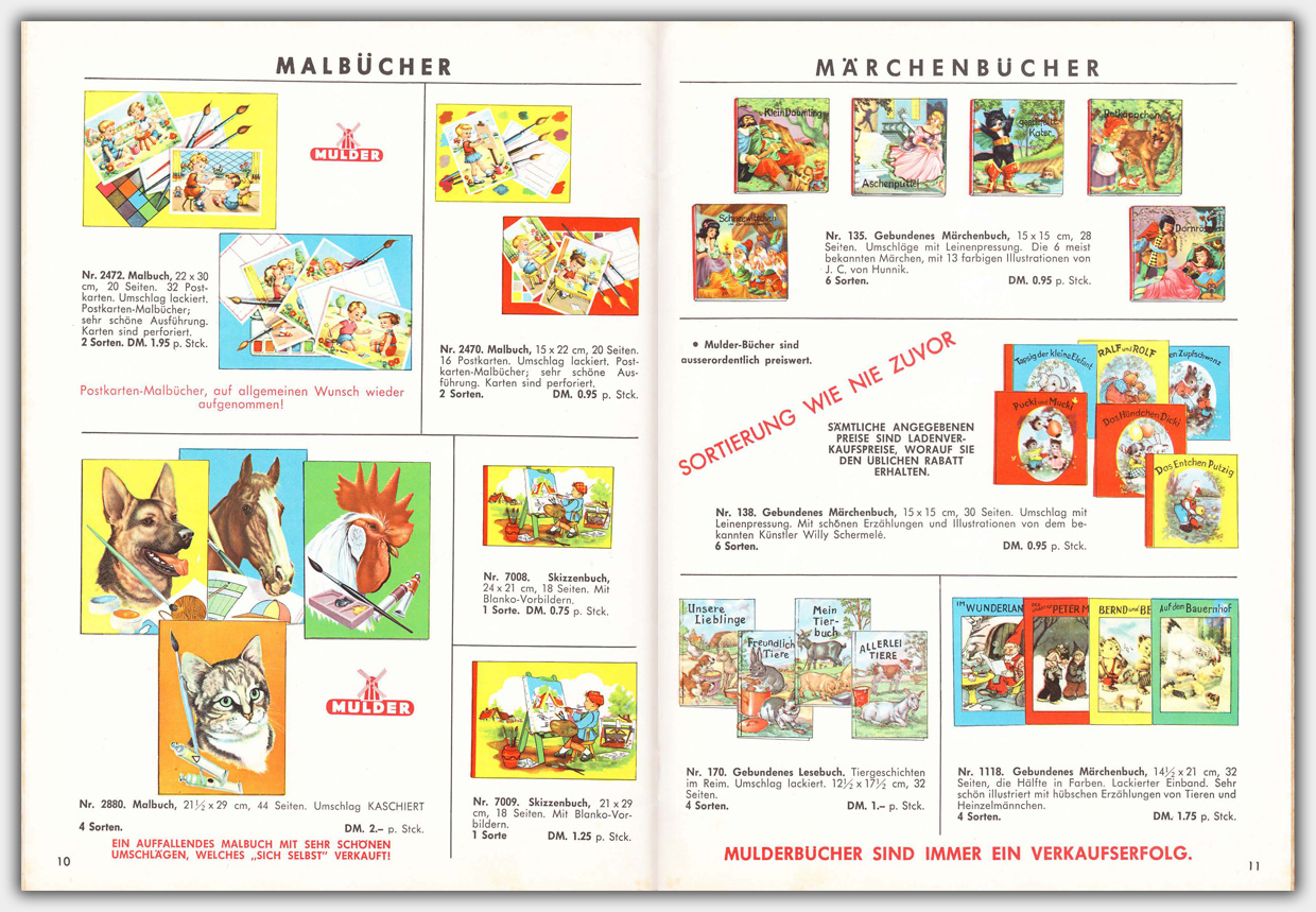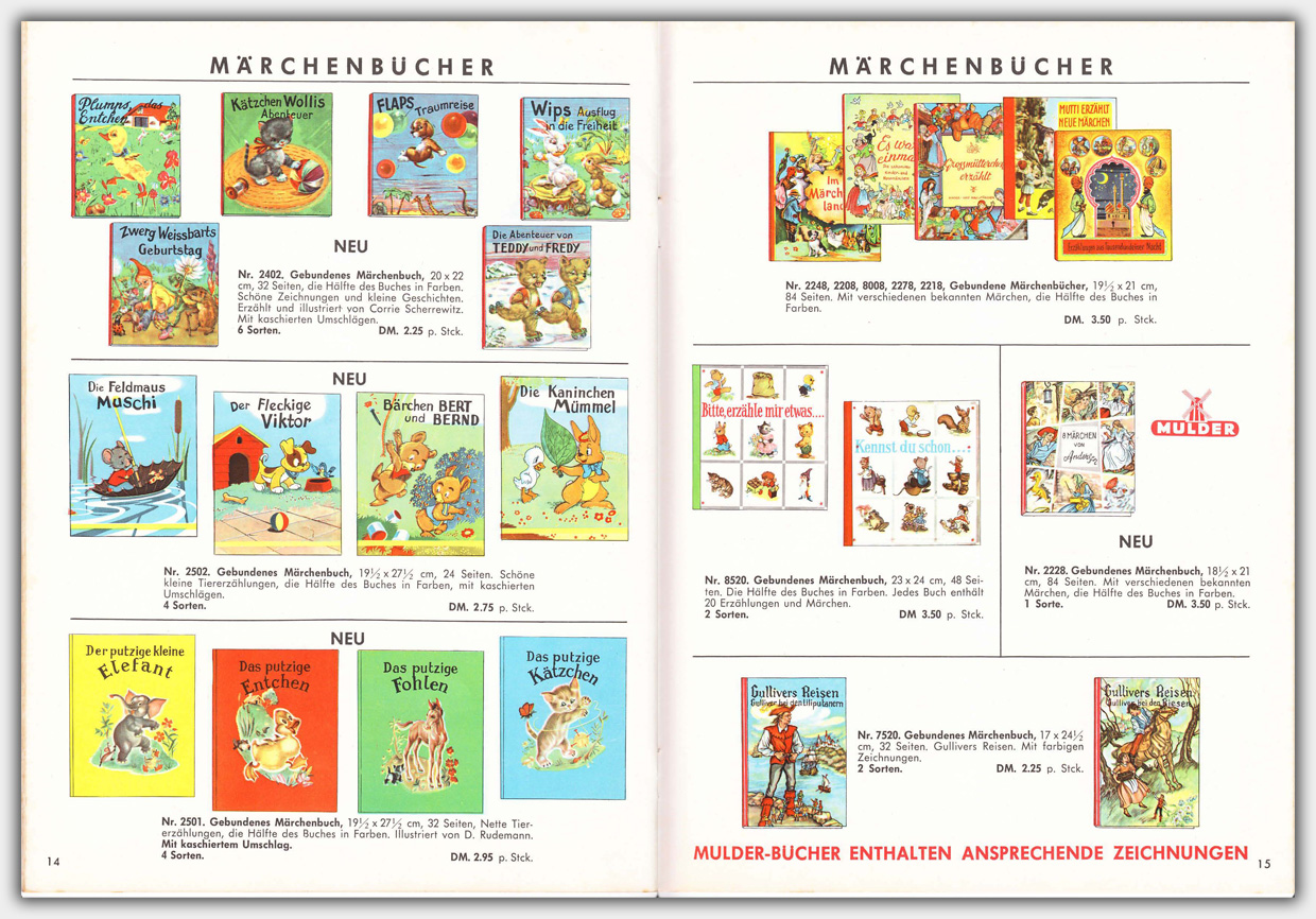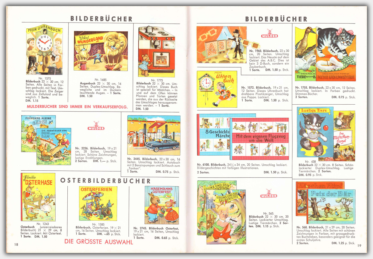 Der Mulder Katalog 1960 / 1961 hat das Format von ca. 29 x 21,5 cm und einen Umfang von 24 Seiten (inkl. Umschlag). Er ist nun farbig. Das Layout erinnert schon sehr stark an die Kataloge die der Favorit Verlag anfang der 1970er Jahre herausgibt. Die Preisangaben sind alle brutto. Evtl. gab es zum Katalog noch eine separate Händlerpreisliste.