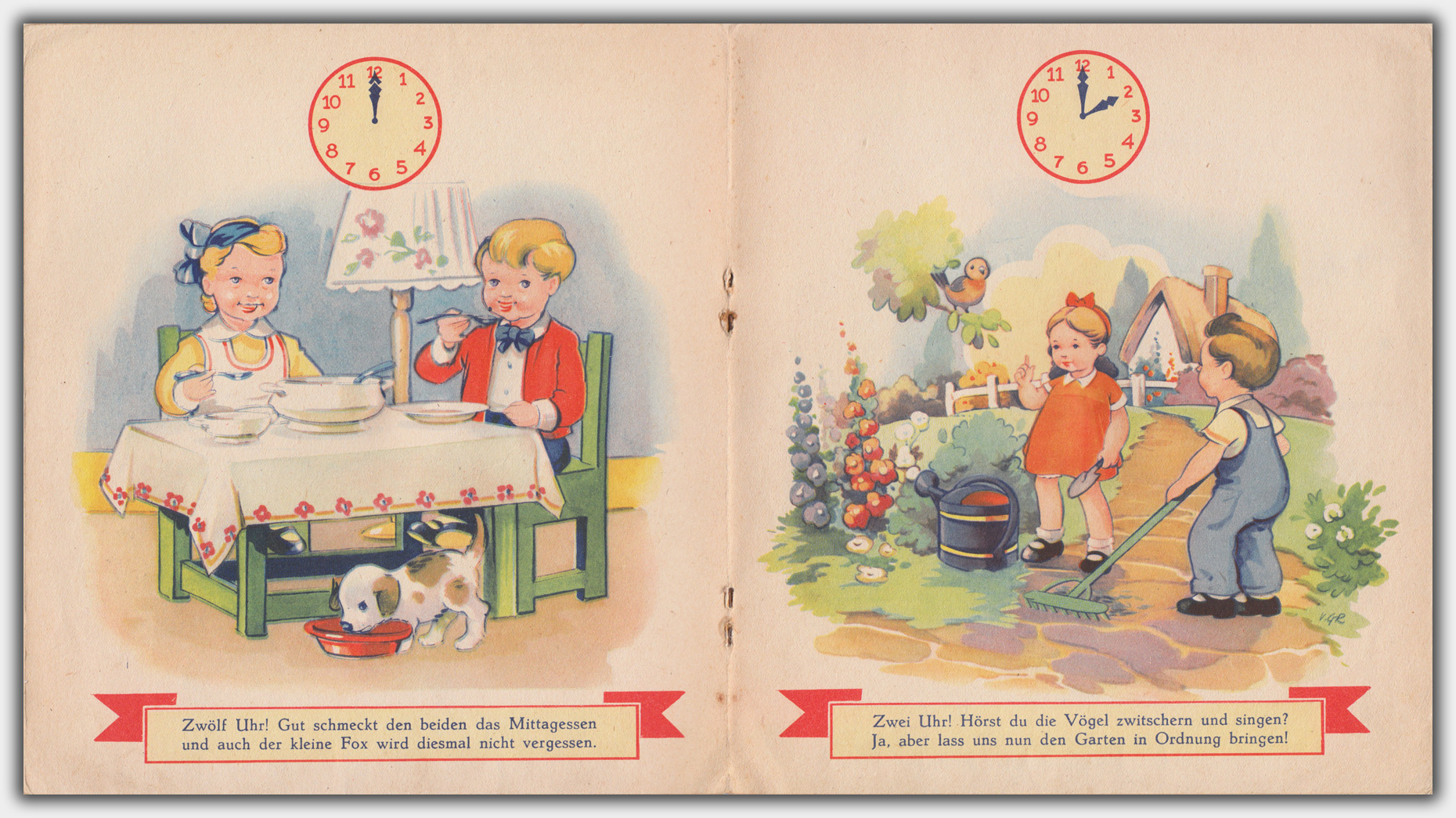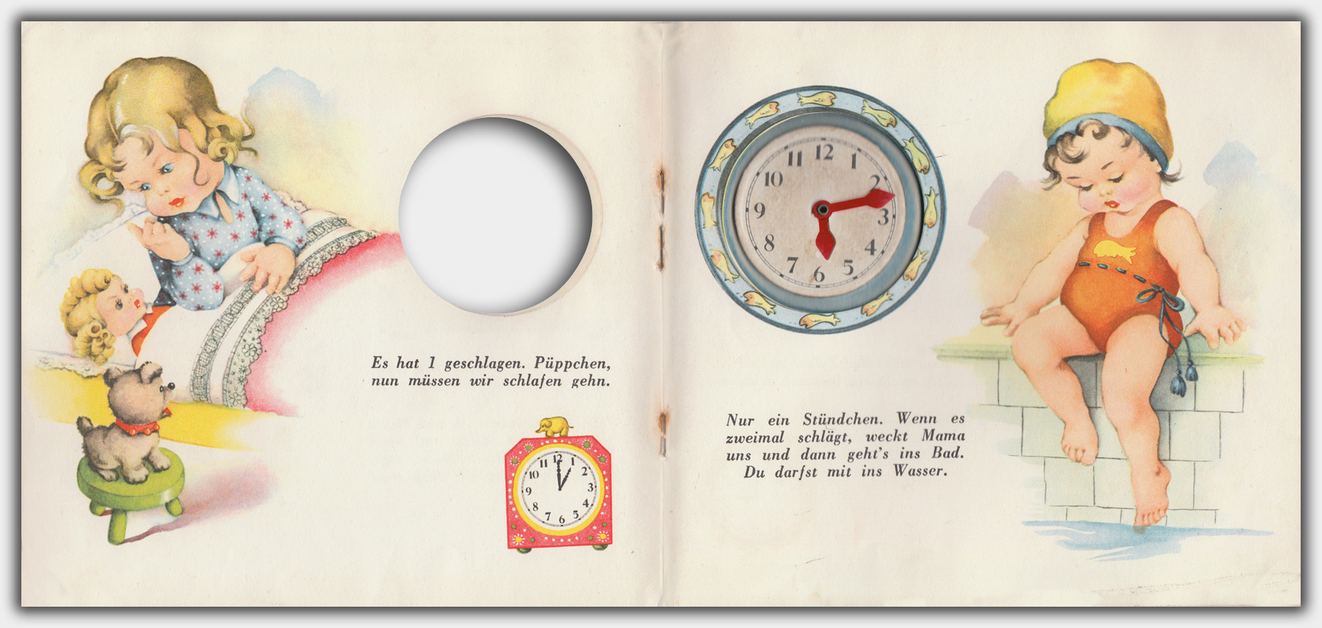 Das erste Buch mit dem Titel Mein Uhrenbuch trägt die Verlagsnummer 1570. Die Illustrationen stammen von Corrie Groos. Das Buch hat eine eingeklebte Pappuhr mit Plastikzeigern, die auf allen Seiten freigestanzt ist. Entgegen der Katalogbeschreibung ist das Format 19,5 x 21,5 cm. Der Umschlag besteht aus dickem Karton. Da das Buch nicht als Neu gekennzeichnet ist, muß es, wie auch der zweite Titel, vor 1956 erschienen sein. Der Verkaufspreis betrug 1,50 DM.