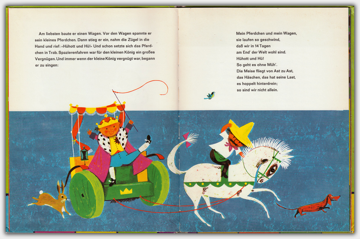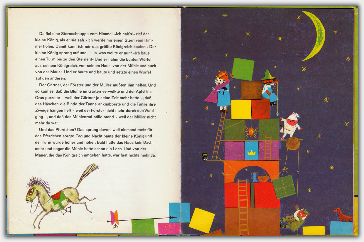 Der Titel Das kunterbunte Königreich erschien 1964 im Obpacher Verlag. Das großformatige Bilderbuch (30 x 23 cm) hat einen Umfang von 24 Seiten und einen Leinenrücken. Die Autoren sind Gerda Marie Scheidl und Herbert Lentz. Das Buch kostete 11,90 DM.