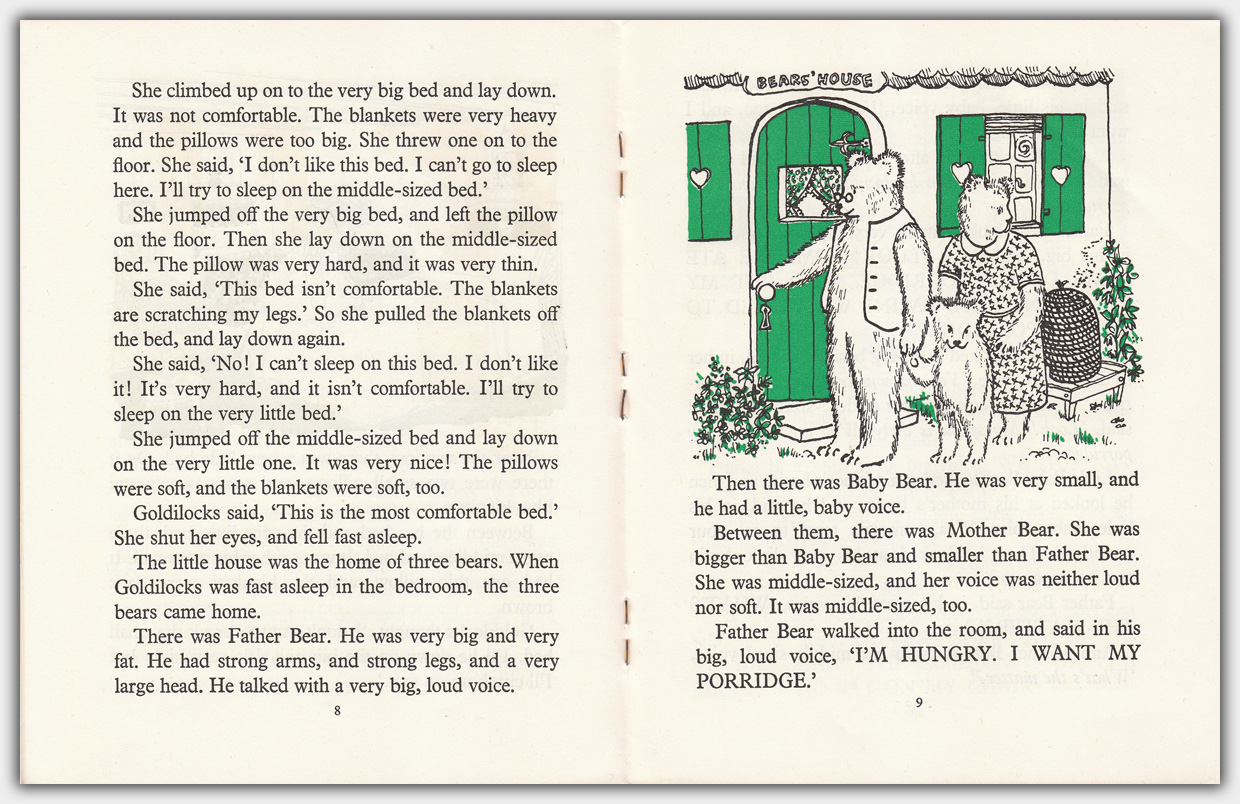 Mir liegen zwei Titel vor. Die Texte stammen von Isabelle Frémont. Es gibt Illustrationen die jeweils Schwarz mit einer weiteren Farbe kombinieren. Die weitere Farbe ist im Heft durchgehend die gleiche, z.B. bei den drei Bären die Farbe Grün.