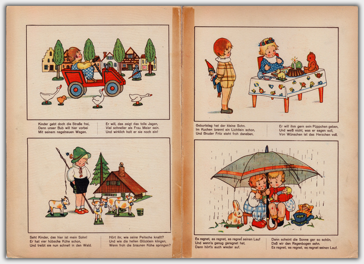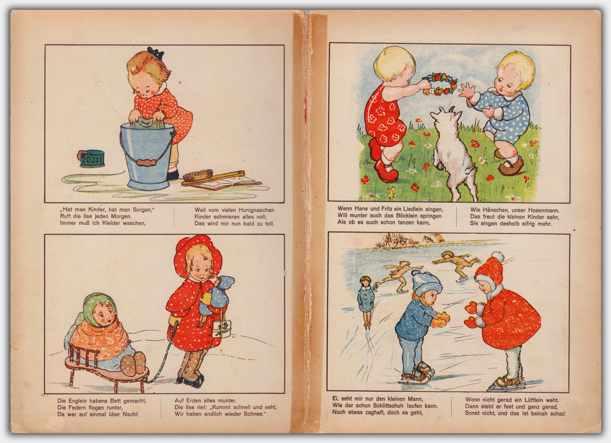 Kunterbunt ist der Titel dieses Buches. Es trägt die Verlagsnummer 1135. Ansonsten gibt es keine weiteren Autoren- oder Verlagsangaben. Mein Exemplar ist leider schon in seine Einzelteile zerfallen. Der Umfang beträgt 5 Kartonblätter, das Format ist 29 x 20 cm. Das Buch hat einen grünen Buchschnitt und einen Buchrücken aus rotem Leinengewebe.