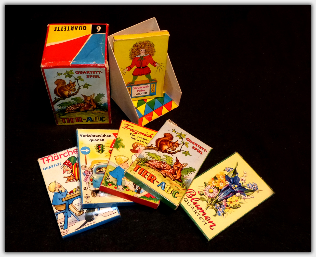 Mir liegt eine Box mit 6 Quartetten vor. Sie dürfte in der zweiten Hälfte der 1950er Jahre erschienen sein. Die Box hat einen mit Titelmotiven bedruckten Stülpdeckel. Darin befinden sich diese Spiele: