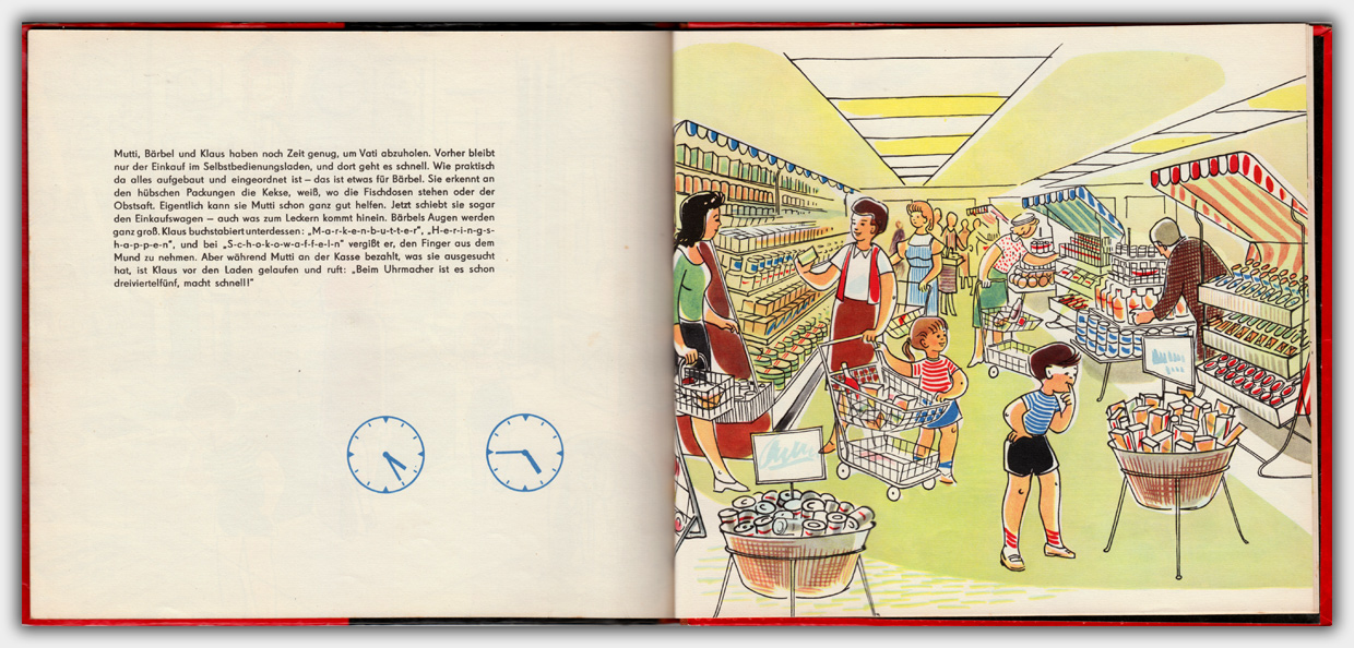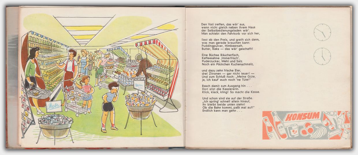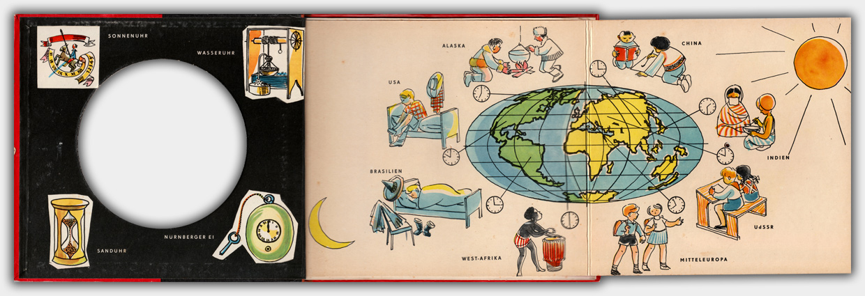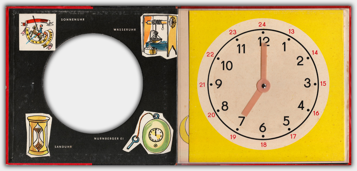 Der Halbleinenband im Format 23 x 27 cm hat eine ausklappbare Uhr mit verstellbaren Zeigern. Die Texte sind in Reimform gehalten. Im Buch gibt es keine Preisangabe. Es gibt allerdings Hinweise sowohl auf das Deutsche Amt für Patent- und Erfindungswesen der DDR wie auch auf das Deutsche Patentamt München. Daher könnte es sein das dieses Buch auch für den Export produziert wurde. Im Katalog der deutschen Nationalbibliothek ist die Preisangabe von 6,80 angegeben. Wahrscheinlich ist dieser Preis ein DM-Preis.