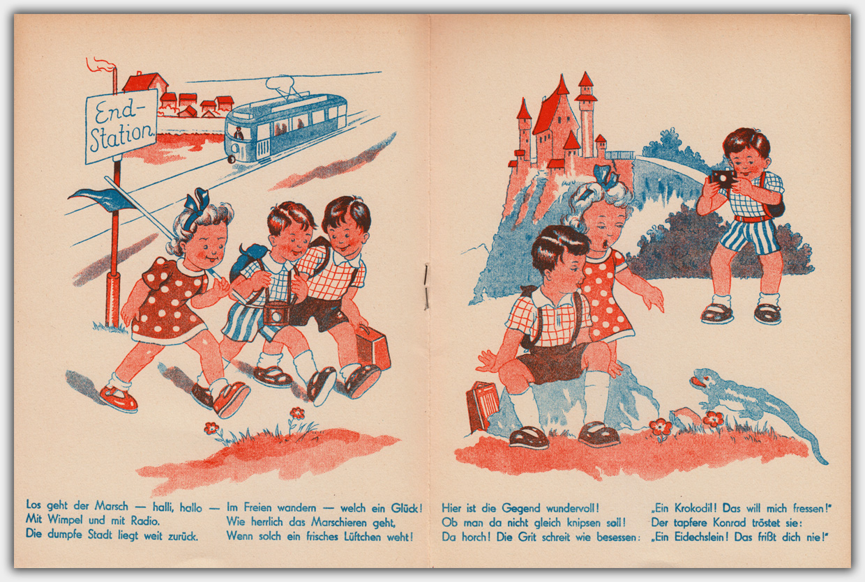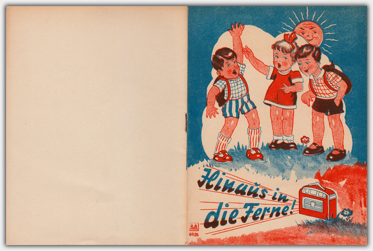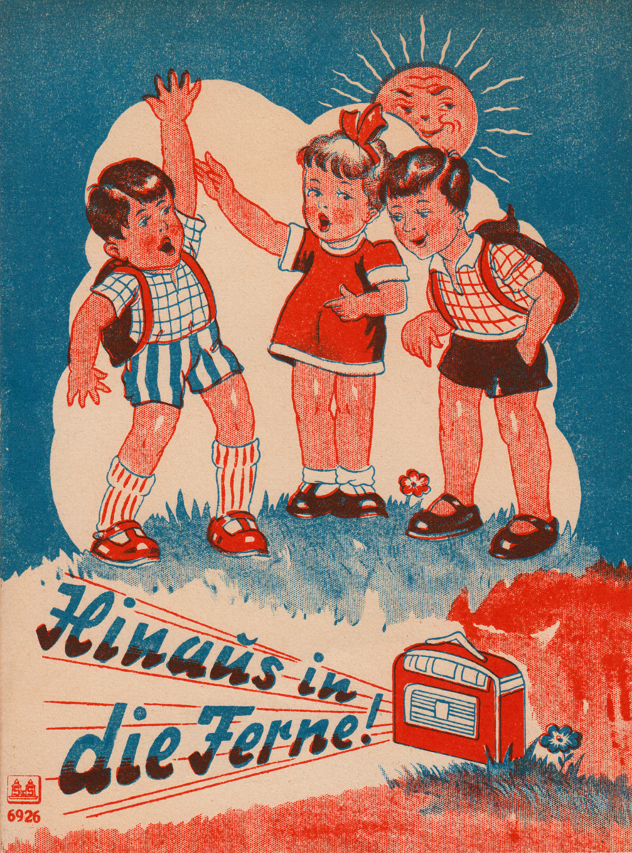 In dem oben abgebildeten Titel Hinaus in die Ferne! nehmen die Kinder ein Kofferradio mit auf ihren Ausflug. Das erste kommerzielle Transistorradio kam Weihnachten 1954 auf den amerikanischen Markt. Auf der Hannover Messe 1957 wurde das erste deutsche Transistorradio vorgestellt. Es ist also mehr als unwahrscheinlich, dass Kofferradios in der Kinderwelt der 1950er Jahre überhaupt vorkamen. Realistischer ist es, dass die Hefte Mitte der 1960er Jahre produziert wurden. Es könnte sich bei diesen Heften um Werbehefte handeln, die auf der Rückseite Platz für einen Werbeaufdruck haben.