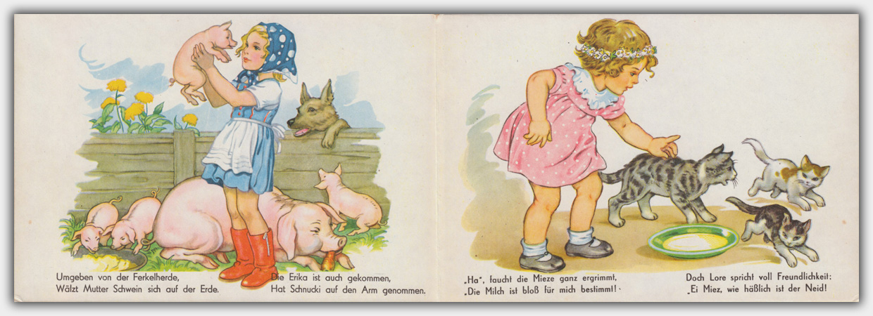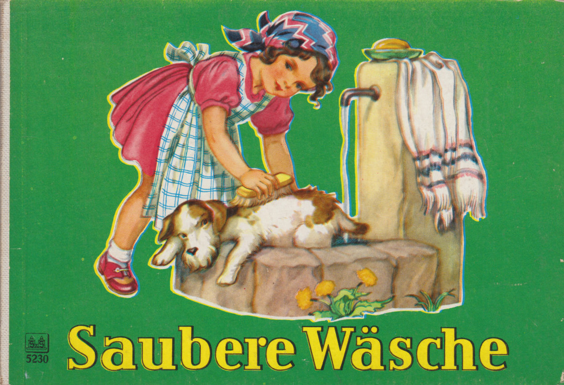 Etwas verwirrend ist auch der Titel Saubere Wäsche der ein Mädchen zeigt, das am Brunnen einen Hund abschrubbt. Das ist aber auch schon das Einzige, das in dem Buch etwas mit Waschen zu tun hat. Außerdem sind teilweise die Texte wahrscheinlich ausgetauscht, sicher aber neu gesetzt worden. Die sieht man an der unterschiedlichen Typo. Bleibt nur die Frage, warum dann nicht gleich alles neu gesetzt wurde. Dieses Buch hat im Gegensatz zu den anderen Titeln auf dieser Seite einen Umfang von 5 Kartonblättern, wobei die mittleren 3 Blätter deutlich dünner sind.
