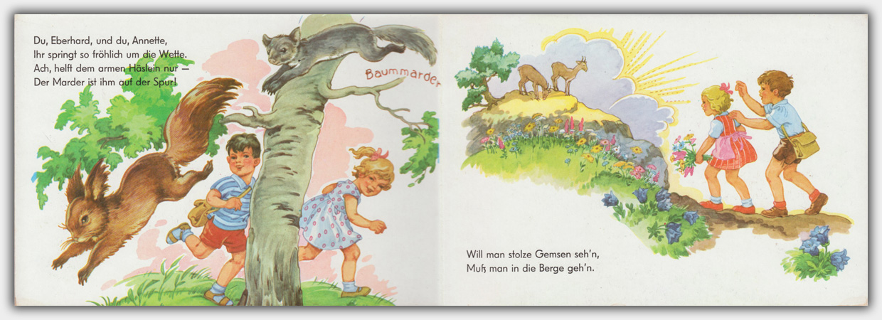 So sind z.B. die Abbildungen und Text der beiden Titel Meine Tiere und Der Besuch 1 zu 1 aus den doppelt so großen (26 cm Höhe) Titeln ⇒ Im Grünen und Frohes Wandern übernommen. Der Titel Der Besuch ist genau genommen die obere Hälfte des Buches Frohes Wandern. Lediglich das Titelbild ist neu. Beim Titel Meine Tiere ist immerhin die Reihenfolge der Seiten verändert. Da sich nicht alle Inhalte in den beiden Büchern finden, vermute ich, das es noch mindestens 2 weitere Titel mit den restlichen Seiten gibt.