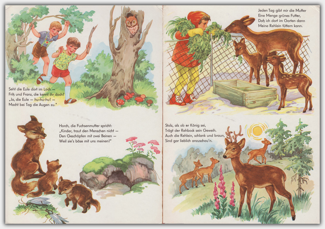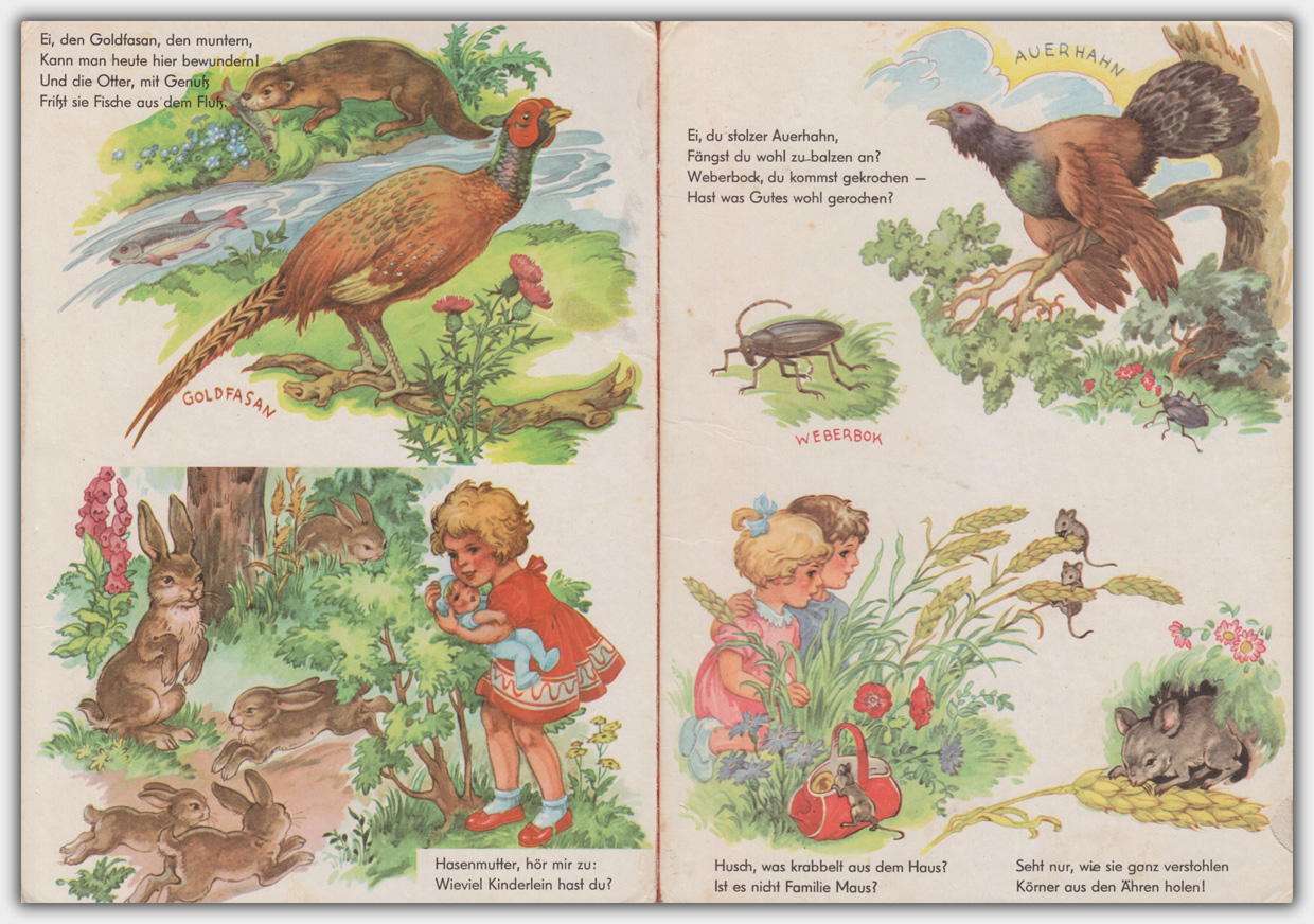 Die Seiten sind so angelegt, dass man aus einem Buch durch einfaches Teilen der Filme / Druckbögen leicht neue Titel produzieren kann. Hinzu kommt dass die Inhalte keine Seitenabfolge vorgeben. Aus den Inhalten der Titel Frohes Wandern und Im Grünen sind so mindestens zwei neue Titel entstanden ⇒ Bilderbücher mit kurzen Texten