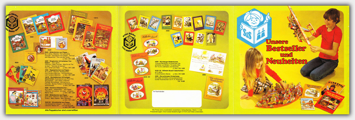 Für meine Recherchen nutze ich u.a. den Werbeflyer Unsere Bestseller und Neuheiten von 1980. Er hat das Format 20 x 21 cm und ist als 6-Seiter gefaltet. Auf der Rückseite ist das Datum 1.9.1980 angegeben.
