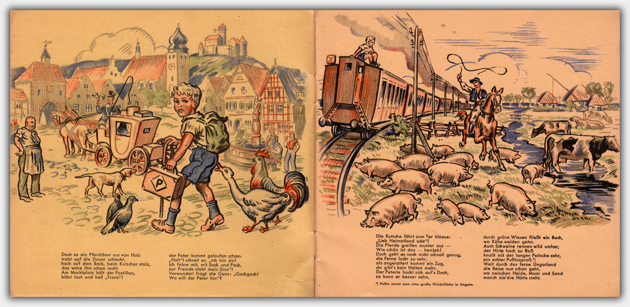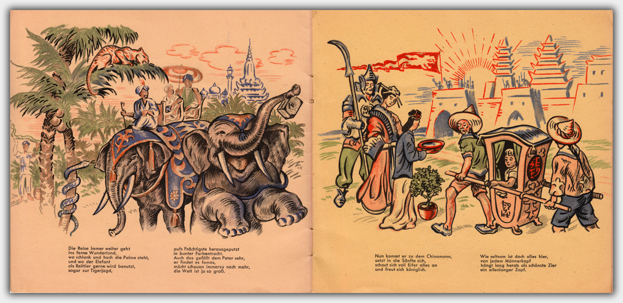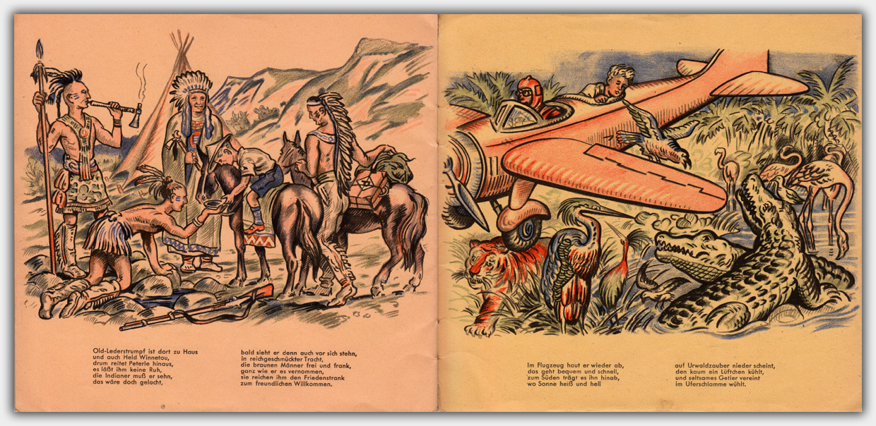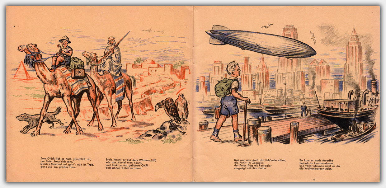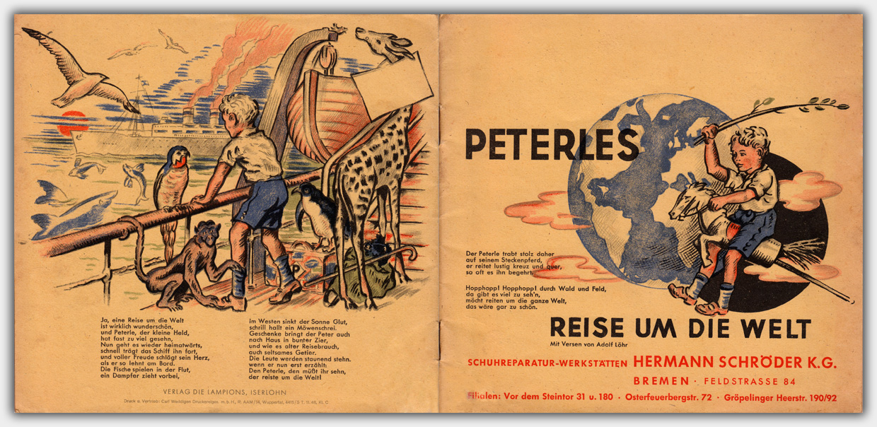 Das Heft Peterles Reise um die Welt liegt mir als Werbeheft mit einem Werbeeindruck vor. Es wurde im November 1948 mit einer Auflage von 5.000 Exemplaren gedruckt. Dies läßt sich zumindest aus dem Druckvermerk auf der Rückseite entnehmen. Die Texte stammen von ⇒ Adolf Löhr, einem Buchhändler und Verfasser von Romanen und Jugendbüchern aus Wuppertal. Das Format ist 19,6 x 20,7 cm, der Umfang beträgt 16 Seiten inkl. Umschlag. Die unterschiedlichen Farbstimmungen stammen von unterschiedlichen Papieren und wirken im Orginal nicht so extrem.