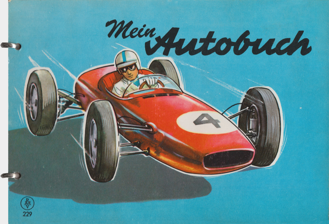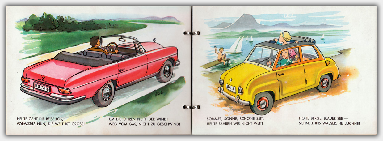 Im Titel Mein Autobuch von 1965 wird u.a. der Mercedes Cabriolet W111 abgebildet. Eigentlich sehr gut getroffen. Allerdings ist das Auto etwas verkürzt dargestellt, die Tür reicht im Orginal nicht bis zum hinteren Radkasten. 🙂