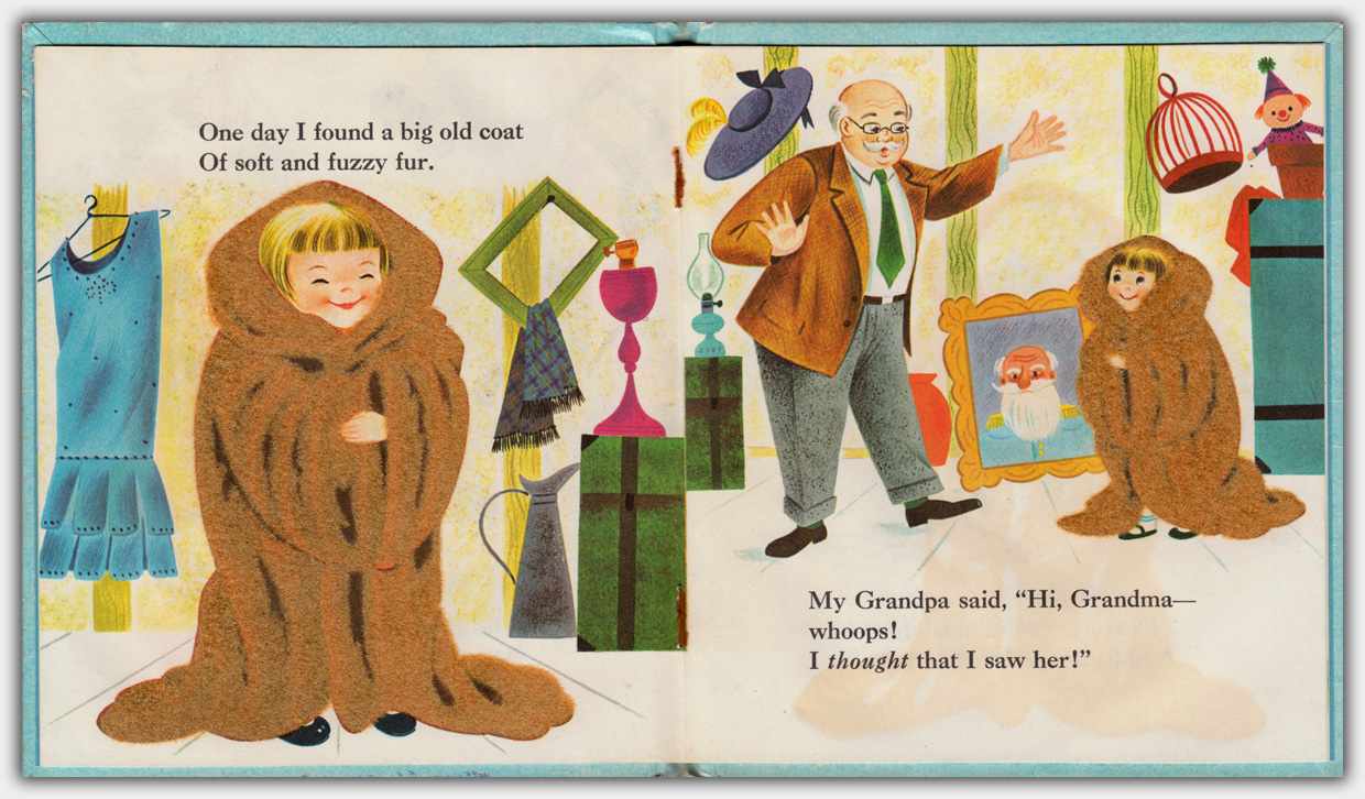 Das Buch 2670 Grandpa’s House gehört zur Fuzzy Wuzzy Reihe. Die Story stammt von Betty Ren Wright, illustriert wurde es von Judy Stang. Einzellne Teile des Buches, wie z.B. der Sessel auf dem Titel oder die Mäntel auf dem zweitem Bild sind mit Kunstfasern beflockt.