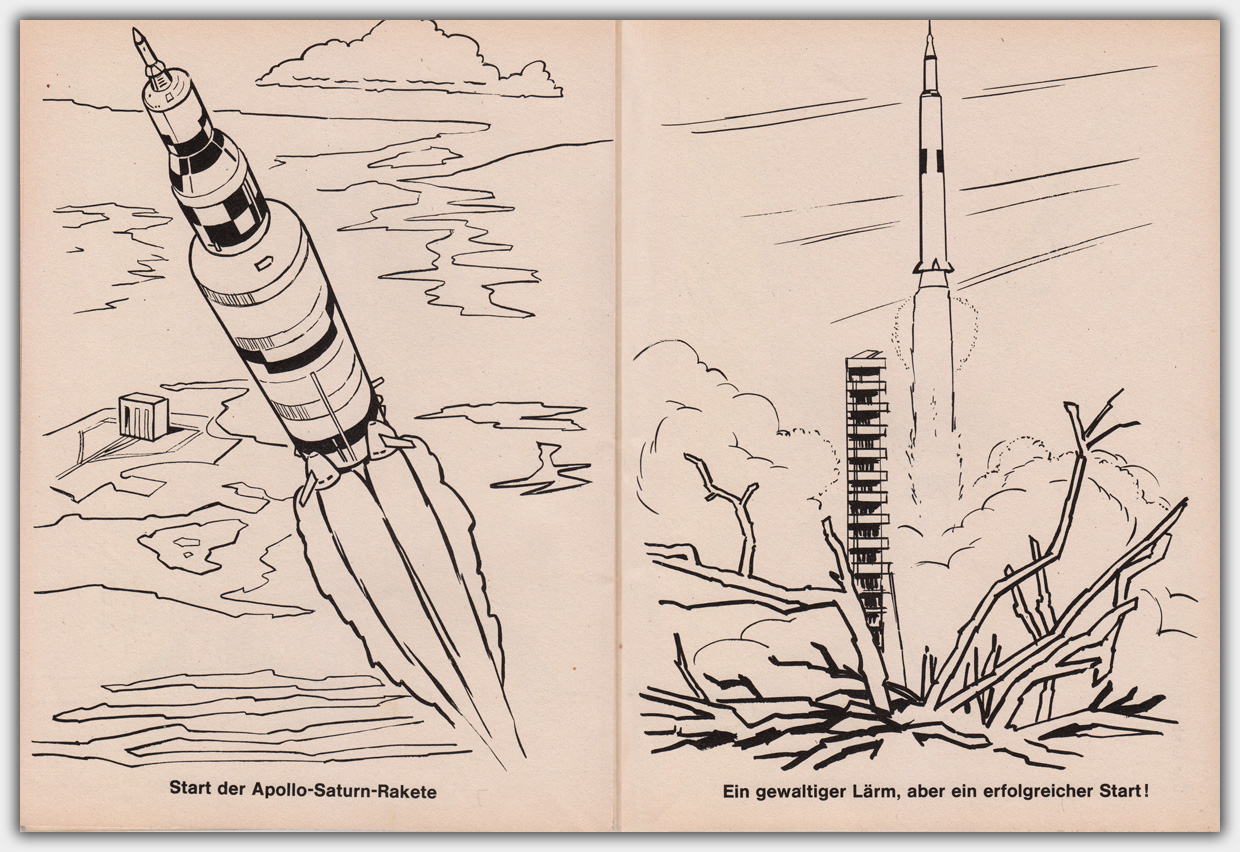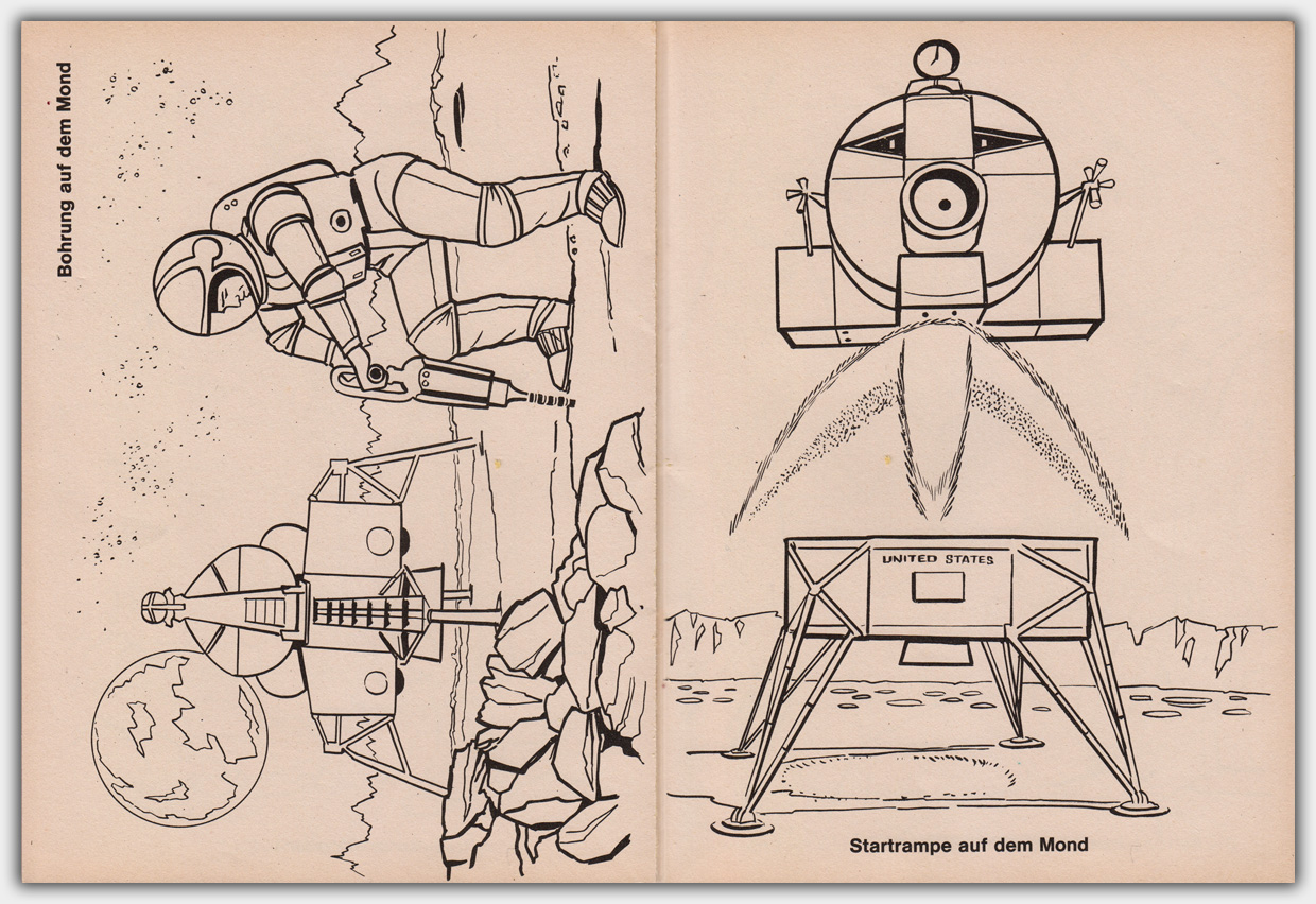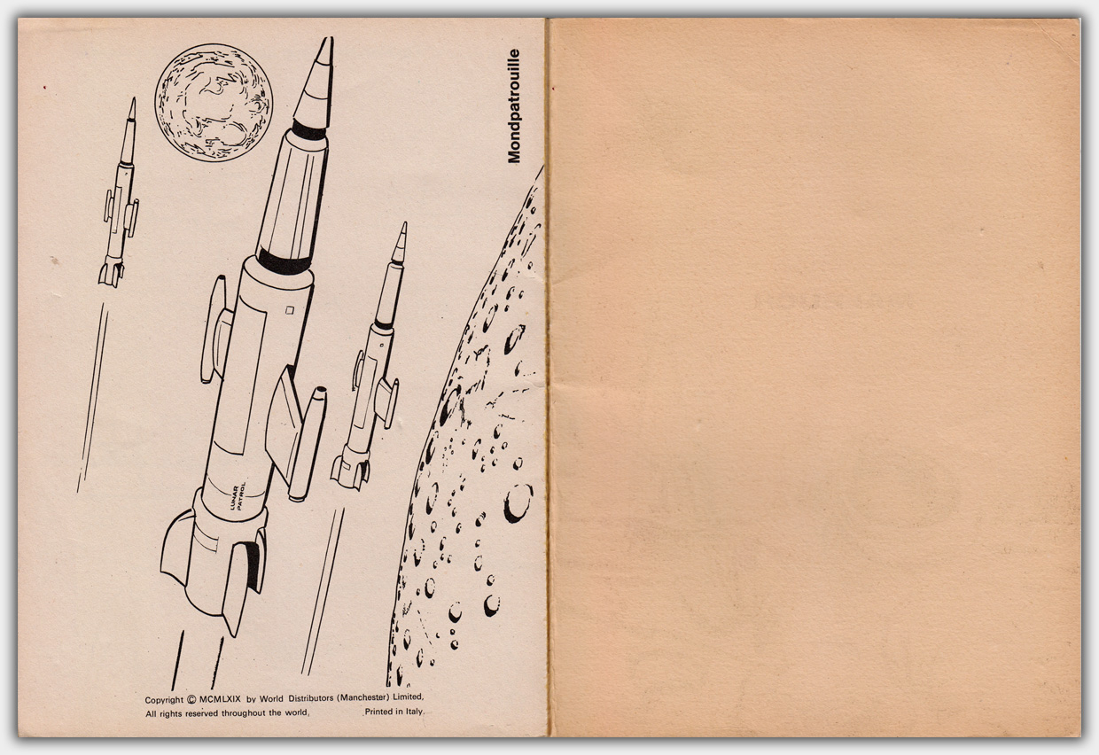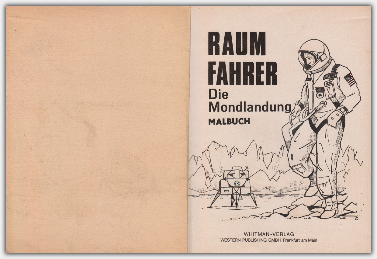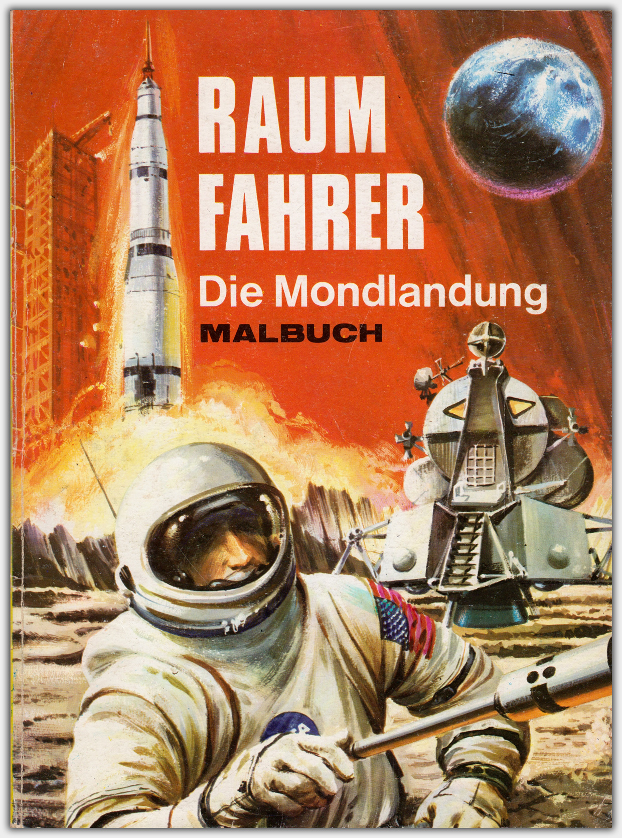 1969 erschien bei World Distributors Ltd. in Manchester ein Malbuch zum, zu der Zeit hochaktuellem Thema Mondlandung. In Deutschland erschien das Buch im Whitman Verlag und trägt den Titel Raum Fahrer Malbuch. Die ganzseitigen Illustrationen/Malvorlagen sind mit kurzen, erklärenden Texte ergänzt. Leider gibt es keine Autorenangaben.